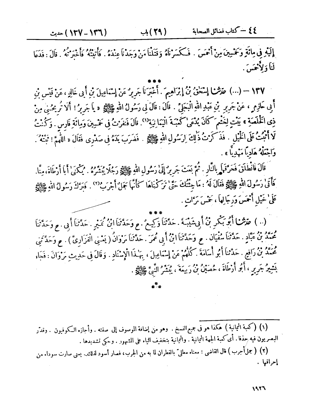 ١٣٧ - حَدَّثَنَا أَبُو بَكْرِ بْنُ أَبِي شَيْبَةَ، حَدَّثَنَا وَكِيعٌ، ح وَحَدَّثَنَا ابْنُ نُمَيْرٍ، حَدَّثَنَا أَبِي، ح وَحَدَّثَنَا مُحَمَّدُ بْنُ عَبَّادٍ، حَدَّثَنَا سُفْيَانُ، ح وَحَدَّثَنَا ابْنُ أَبِي عُمَرَ، حَدَّثَنَا مَرْوَانُ يَعْنِي الْفَزَارِيَّ، ح وحَدَّثَنِي مُحَمَّدُ بْنُ رَافِعٍ، حَدَّثَنَا أَبُو أُسَامَةَ كُلُّهُمْ، عَنْ إِسْمَاعِيلَ، بِهَذَا الْإِسْنَادِ، وَقَالَ فِي حَدِيثِ مَرْوَانَ: فَجَاءَ بَشِيرُ جَرِيرٍ أَبُو أَرْطَاةَ حُصَيْنُ بْنُ رَبِيعَةَ، يُبَشِّرُ النَّبِيَّ صَلَّى اللهُ عَلَيْهِ وَسَلَّمَ