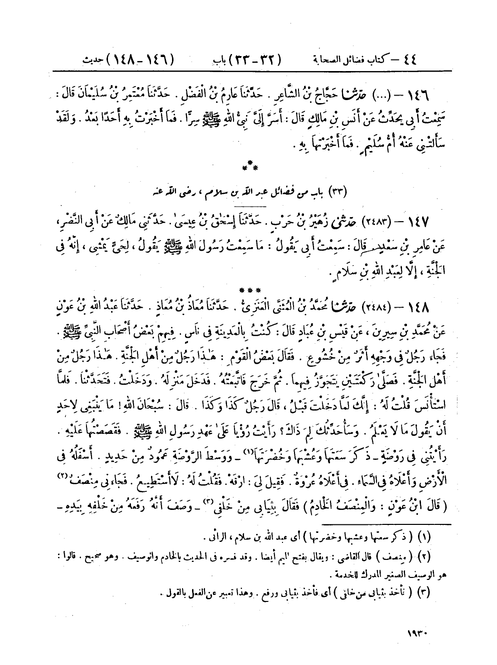 ١٤٧ - (٢٤٨٣) حَدَّثَنِي زُهَيْرُ بْنُ حَرْبٍ، حَدَّثَنَا إِسْحَاقُ بْنُ عِيسَى، حَدَّثَنِي مَالِكٌ، عَنْ أَبِي النَّضْرِ، عَنْ عَامِرِ بْنِ سَعْدٍ، قَالَ: سَمِعْتُ أَبِي يَقُولُ: مَا سَمِعْتُ رَسُولَ اللهِ صَلَّى اللهُ عَلَيْهِ وَسَلَّمَ يَقُولُ: «لِحَيٍّ يَمْشِي، إِنَّهُ فِي الْجَنَّةِ إِلَّا لِعَبْدِ اللهِ بْنِ سَلَامٍ»