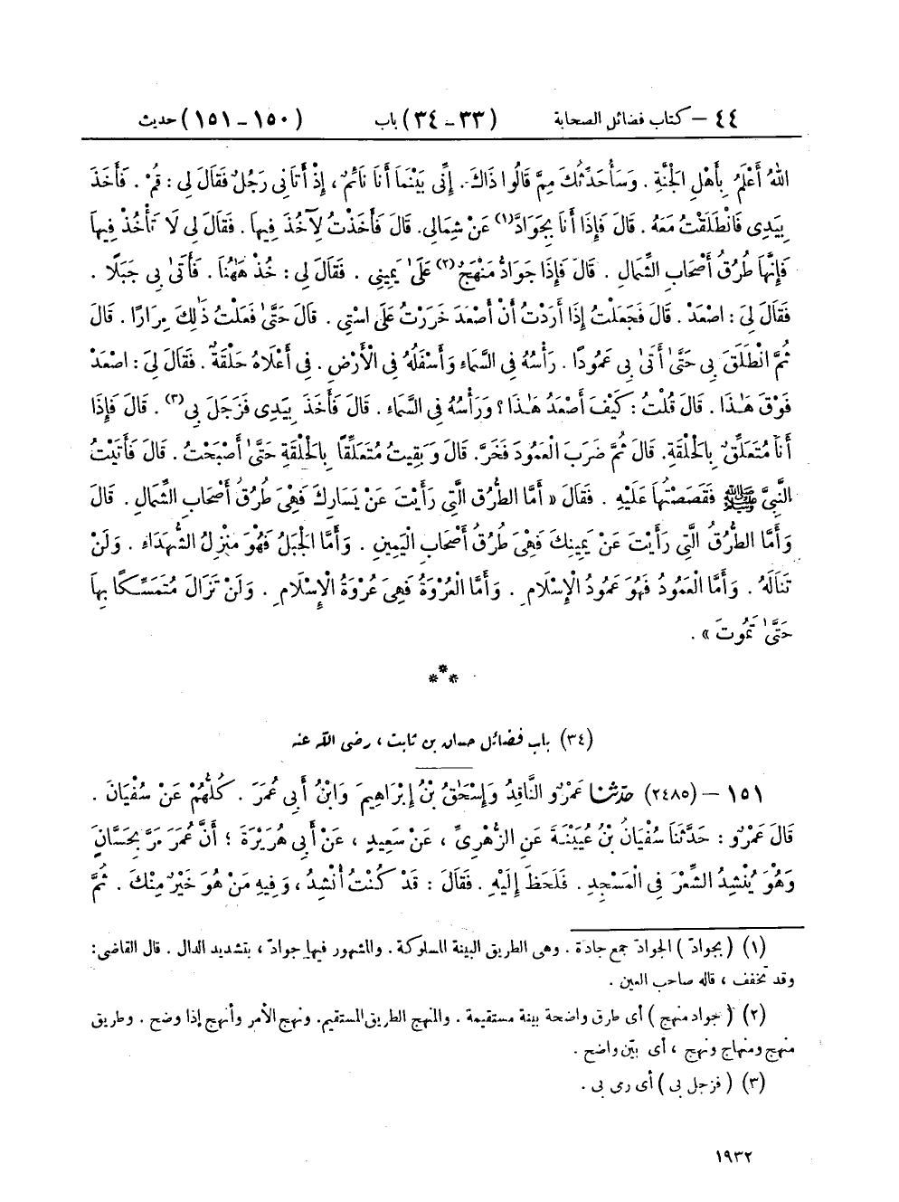 ١٥١ - (٢٤٨٥) حَدَّثَنَا عَمْرٌو النَّاقِدُ، وَإِسْحَاقُ بْنُ إِبْرَاهِيمَ، وَابْنُ أَبِي عُمَرَ، كُلُّهُمْ عَنْ سُفْيَانَ، قَالَ: عَمْرٌو، حَدَّثَنَا سُفْيَانُ بْنُ عُيَيْنَةَ، عَنِ الزُّهْرِيِّ، عَنْ سَعِيدٍ، عَنْ أَبِي هُرَيْرَةَ، أَنَّ عُمَرَ، مَرَّ بِحَسَّانَ وَهُوَ يُنْشِدُ الشِّعْرَ فِي الْمَسْجِدِ، فَلَحَظَ إِلَيْهِ، فَقَالَ: قَدْ كُنْتُ أُنْشِدُ، وَفِيهِ مَنْ هُوَ خَيْرٌ مِنْكَ، ثُمَّ الْتَفَتَ إِلَى أَبِي هُرَيْرَةَ، فَقَالَ: أَنْشُدُكَ اللهَ أَسَمِعْتَ رَسُولَ اللهِ صَلَّى اللهُ عَلَيْهِ وَسَلَّمَ يَقُولُ: «أَجِبْ عَنِّي، اللهُمَّ أَيِّدْهُ بِرُوحِ الْقُدُسِ»؟ قَالَ: اللهُمَّ نَعَمْ.