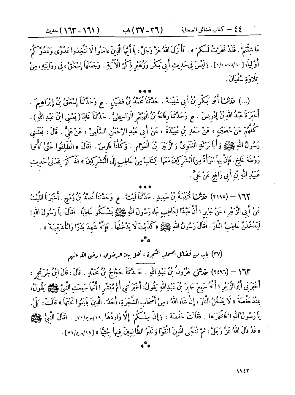 ١٦١ - حَدَّثَنَا أَبُو بَكْرِ بْنُ أَبِي شَيْبَةَ، حَدَّثَنَا مُحَمَّدُ بْنُ فُضَيْلٍ، ح وَحَدَّثَنَا إِسْحَاقُ بْنُ إِبْرَاهِيمَ، أَخْبَرَنَا عَبْدُ اللهِ بْنُ إِدْرِيسَ، ح وَحَدَّثَنَا رِفَاعَةُ بْنُ الْهَيْثَمِ الْوَاسِطِيُّ، حَدَّثَنَا خَالِدٌ يَعْنِي ابْنَ عَبْدِ اللهِ، كُلُّهُمْ عَنْ حُصَيْنٍ، عَنْ سَعْدِ بْنِ عُبَيْدَةَ، عَنْ أَبِي عَبْدِ الرَّحْمَنِ السُّلَمِيِّ، عَنْ عَلِيٍّ، قَالَ: بَعَثَنِي رَسُولُ اللهِ صَلَّى اللهُ عَلَيْهِ وَسَلَّمَ، وَأَبَا مَرْثَدٍ الْغَنَوِيَّ، وَالزُّبَيْرَ بْنَ الْعَوَّامِ، وَكُلُّنَا فَارِسٌ فَقَالَ: «انْطَلِقُوا حَتَّى تَأْتُوا رَوْضَةَ خَاخٍ، فَإِنَّ بِهَا امْرَأَةً مِنَ الْمُشْرِكِينَ مَعَهَا كِتَابٌ مِنْ حَاطِبٍ إِلَى الْمُشْرِكِينَ» فَذَكَرَ بِمَعْنَى حَدِيثِ عُبَيْدِ اللهِ بْنِ أَبِي رَافِعٍ، عَنْ عَلِيٍّ