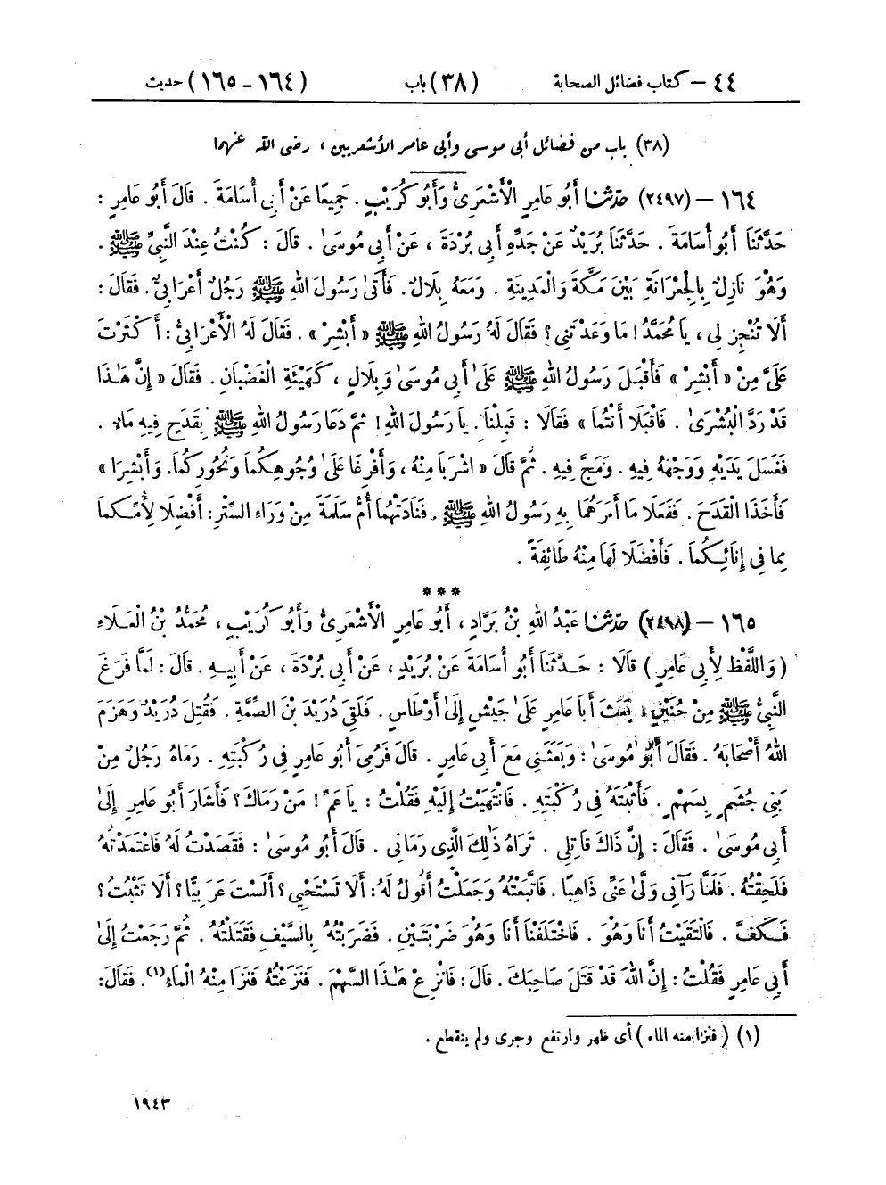 ١٦٥ - (٢٤٩٨) حَدَّثَنَا عَبْدُ اللهِ بْنُ بَرَّادٍ أَبُو عَامِرٍ الْأَشْعَرِيُّ، وَأَبُو كُرَيْبٍ مُحَمَّدُ بْنُ الْعَلَاءِ، وَاللَّفْظُ لِأَبِي عَامِرٍ، قَالَا: حَدَّثَنَا أَبُو أُسَامَةَ، عَنْ بُرَيْدٍ، عَنْ أَبِي بُرْدَةَ، عَنْ أَبِيهِ، قَالَ: لَمَّا فَرَغَ النَّبِيُّ صَلَّى اللهُ عَلَيْهِ وَسَلَّمَ، مِنْ حُنَيْنٍ، بَعَثَ أَبَا عَامِرٍ عَلَى جَيْشٍ إِلَى أَوْطَاسٍ، فَلَقِيَ دُرَيْدَ بْنَ الصِّمَّةِ، فَقُتِلَ دُرَيْدٌ وَهَزَمَ اللهُ أَصْحَابَهُ، فَقَالَ أَبُو مُوسَى: وَبَعَثَنِي مَعَ أَبِي عَامِرٍ، قَالَ: فَرُمِيَ أَبُو عَامِرٍ فِي رُكْبَتِهِ، رَمَاهُ رَجُلٌ مِنْ بَنِي جُشَمٍ بِسَهْمٍ، فَأَثْبَتَهُ فِي رُكْبَتِهِ فَانْتَهَيْتُ إِلَيْهِ فَقُلْتُ: يَا عَمِّ مَنْ رَمَاكَ؟ فَأَشَارَ أَبُو عَامِرٍ إِلَى أَبِي مُوسَى، فَقَالَ: إِنَّ ذَاكَ قَاتِلِي، تَرَاهُ ذَلِكَ الَّذِي رَمَانِي، قَالَ أَبُو مُوسَى: فَقَصَدْتُ لَهُ فَاعْتَمَدْتُهُ فَلَحِقْتُهُ، فَلَمَّا رَآنِي وَلَّى عَنِّي ذَاهِبًا، فَاتَّبَعْتُهُ وَجَعَلْتُ أَقُولُ لَهُ: أَلَا تَسْتَحْيِي؟ أَلَسْتَ عَرَبِيًّا؟ أَلَا تَثْبُتُ؟ فَكَفَّ، فَالْتَقَيْتُ أَنَا وَهُوَ، فَاخْتَلَفْنَا أَنَا وَهُوَ ضَرْبَتَيْنِ، فَضَرَبْتُهُ بِالسَّيْفِ فَقَتَلْتُهُ، ثُمَّ رَجَعْتُ إِلَى أَبِي عَامِرٍ فَقُلْتُ: إِنَّ اللهَ قَدْ قَتَلَ صَاحِبَكَ، قَالَ: فَانْزِعْ هَذَا السَّهْمَ، فَنَزَعْتُهُ فَنَزَا مِنْهُ الْمَاءُ، فَقَالَ: يَا ابْنَ أَخِي انْطَلِقْ إِلَى رَسُولِ اللهِ صَلَّى اللهُ عَلَيْهِ وَسَلَّمَ فَأَقْرِئْهُ مِنِّي السَّلَامَ، وَقُلْ لَهُ: يَقُولُ لَكَ أَبُو عَامِرٍ: اسْتَغْفِرْ لِي، قَالَ: وَاسْتَعْمَلَنِي أَبُو عَامِرٍ عَلَى النَّاسِ، وَمَكَثَ يَسِيرًا ثُمَّ إِنَّهُ مَاتَ، فَلَمَّا رَجَعْتُ إِلَى النَّبِيِّ صَلَّى اللهُ عَلَيْهِ وَسَلَّمَ دَخَلْتُ عَلَيْهِ، وَهُوَ فِي بَيْتٍ عَلَى سَرِيرٍ مُرْمَلٍ، وَعَلَيْهِ فِرَاشٌ، وَقَدْ أَثَّرَ رِمَالُ السَّرِيرِ بِظَهْرِ رَسُولِ اللهِ صَلَّى اللهُ عَلَيْهِ وَسَلَّمَ وَجَنْبَيْهِ، فَأَخْبَرْتُهُ بِخَبَرِنَا وَخَبَرِ أَبِي عَامِرٍ، وَقُلْتُ لَهُ: قَالَ: قُلْ لَهُ: يَسْتَغْفِرْ لِي، فَدَعَا رَسُولُ اللهِ صَلَّى اللهُ عَلَيْهِ وَسَلَّمَ بِمَاءٍ، فَتَوَضَّأَ مِنْهُ، ثُمَّ رَفَعَ يَدَيْهِ، ثُمَّ قَالَ: «اللهُمَّ اغْفِرْ لِعُبَيْدٍ أَبِي عَامِرٍ» حَتَّى رَأَيْتُ بَيَاضَ إِبْطَيْهِ، ثُمَّ قَالَ: «اللهُمَّ اجْعَلْهُ يَوْمَ الْقِيَامَةِ فَوْقَ كَثِيرٍ مِنْ خَلْقِكَ، أَوْ مِنَ النَّاسِ» فَقُلْتُ: وَلِي، يَا رَسُولَ اللهِ فَاسْتَغْفِرْ، فَقَالَ النَّبِيُّ صَلَّى اللهُ عَلَيْهِ وَسَلَّمَ: «اللهُمَّ اغْفِرْ لِعَبْدِ اللهِ بْنِ قَيْسٍ ذَنْبَهُ، وَأَدْخِلْهُ يَوْمَ الْقِيَامَةِ مُدْخَلًا كَرِيمًا» قَالَ أَبُو بُرْدَةَ: إِحَدَاهُمَا لِأَبِي عَامِرٍ، وَالْأُخْرَى لِأَبِي مُوسَى