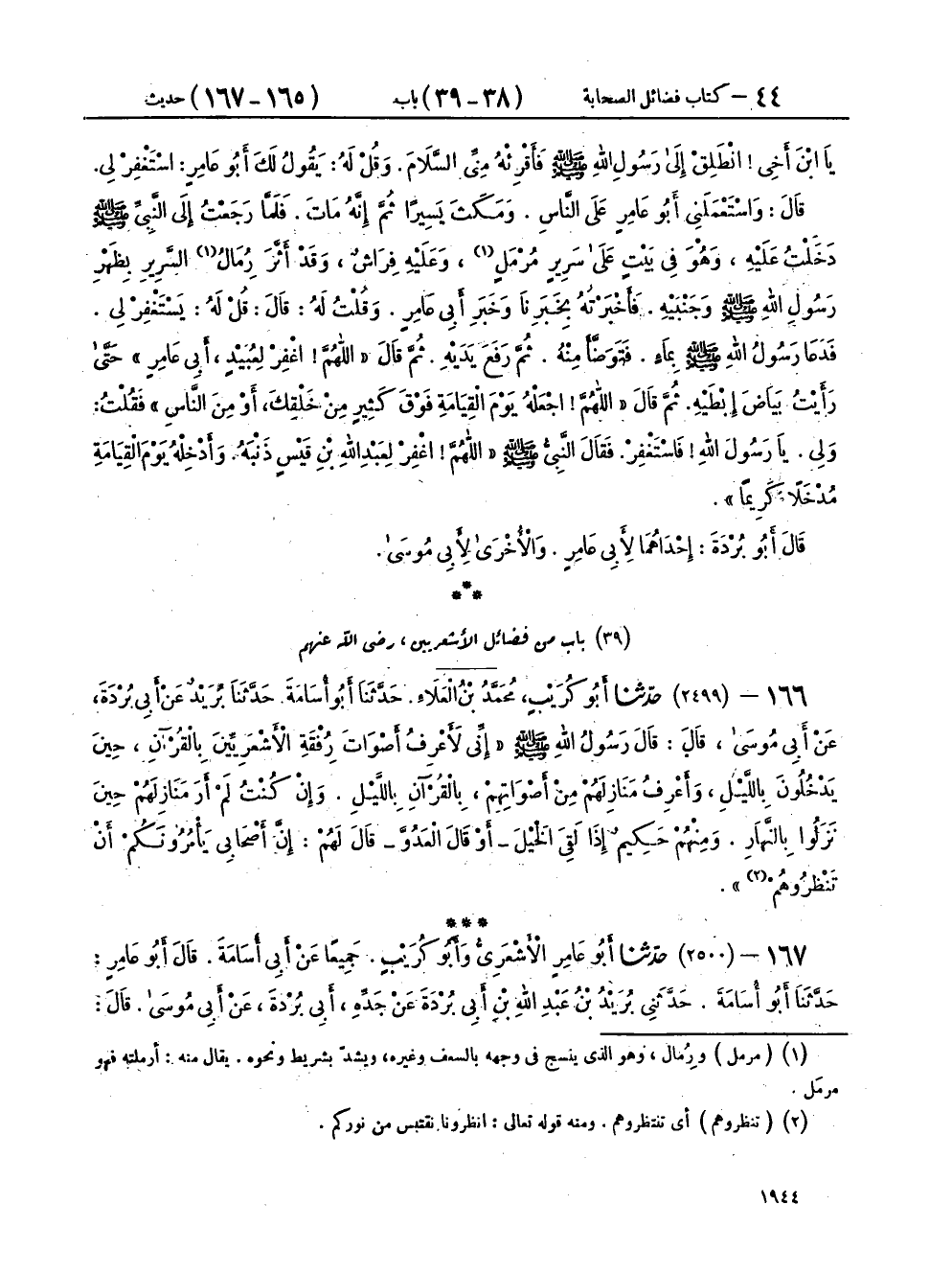 ١٦٦ - (٢٤٩٩) حَدَّثَنَا أَبُو كُرَيْبٍ مُحَمَّدُ بْنُ الْعَلَاءِ، حَدَّثَنَا أَبُو أُسَامَةَ، حَدَّثَنَا بُرَيْدٌ، عَنْ أَبِي بُرْدَةَ، عَنْ أَبِي مُوسَى، قَالَ: قَالَ رَسُولُ اللهِ صَلَّى اللهُ عَلَيْهِ وَسَلَّمَ: " إِنِّي لَأَعْرِفُ أَصْوَاتَ رُفْقَةِ الْأَشْعَرِيِّينَ بِالْقُرْآنِ حِينَ يَدْخُلُونَ بِاللَّيْلِ، وَأَعْرِفُ مَنَازِلَهُمْ مِنْ أَصْوَاتِهِمْ، بِالْقُرْآنِ بِاللَّيْلِ، وَإِنْ كُنْتُ لَمْ أَرَ مَنَازِلَهُمْ حِينَ نَزَلُوا بِالنَّهَارِ، وَمِنْهُمْ حَكِيمٌ إِذَا لَقِيَ الْخَيْلَ - أَوْ قَالَ الْعَدُوَّ - قَالَ لَهُمْ: إِنَّ أَصْحَابِي يَأْمُرُونَكُمْ أَنْ تَنْظُرُوهُمْ "