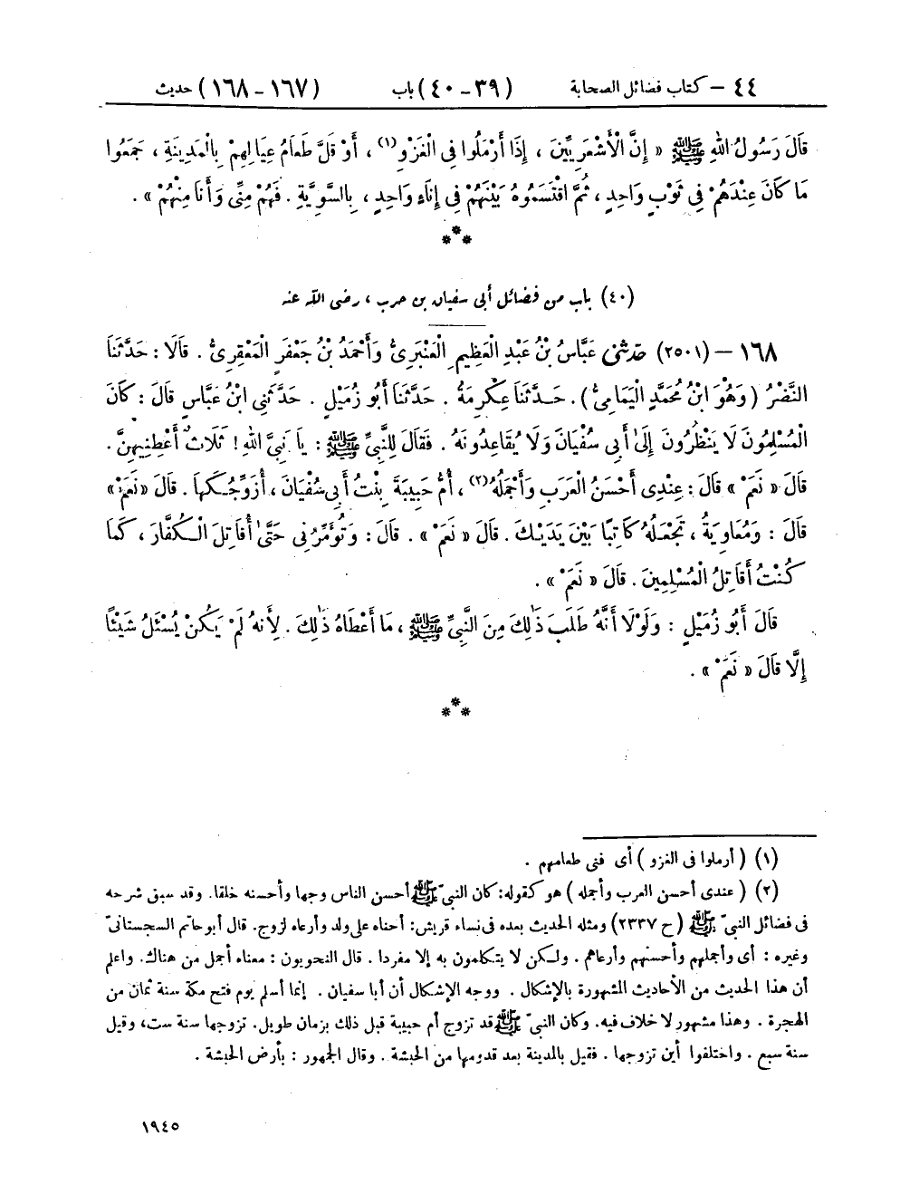 ١٦٨ - (٢٥٠١) حَدَّثَنِي عَبَّاسُ بْنُ عَبْدِ الْعَظِيمِ الْعَنْبَرِيُّ، وَأَحْمَدُ بْنُ جَعْفَرٍ الْمَعْقِرِيُّ، قَالَا: حَدَّثَنَا النَّضْرُ وَهُوَ ابْنُ مُحَمَّدٍ الْيَمَامِيُّ، حَدَّثَنَا عِكْرِمَةُ، حَدَّثَنَا أَبُو زُمَيْلٍ، حَدَّثَنِي ابْنُ عَبَّاسٍ، قَالَ: كَانَ الْمُسْلِمُونَ لَا يَنْظُرُونَ إِلَى أَبِي سُفْيَانَ وَلَا يُقَاعِدُونَهُ، فَقَالَ لِلنَّبِيِّ صَلَّى اللهُ عَلَيْهِ وَسَلَّمَ: يَا نَبِيَّ اللهِ ثَلَاثٌ أَعْطِنِيهِنَّ، قَالَ: «نَعَمْ» قَالَ: عِنْدِي أَحْسَنُ الْعَرَبِ وَأَجْمَلُهُ، أُمُّ حَبِيبَةَ بِنْتُ أَبِي سُفْيَانَ، أُزَوِّجُكَهَا، قَالَ: «نَعَمْ» قَالَ: وَمُعَاوِيَةُ، تَجْعَلُهُ كَاتِبًا بَيْنَ يَدَيْكَ، قَالَ: «نَعَمْ» قَالَ: وَتُؤَمِّرُنِي حَتَّى أُقَاتِلَ الْكُفَّارَ، كَمَا كُنْتُ أُقَاتِلُ الْمُسْلِمِينَ، قَالَ: «نَعَمْ» قَالَ أَبُو زُمَيْلٍ: وَلَوْلَا أَنَّهُ طَلَبَ ذَلِكَ مِنَ النَّبِيِّ صَلَّى اللهُ عَلَيْهِ وَسَلَّمَ مَا أَعْطَاهُ ذَلِكَ، لِأَنَّهُ لَمْ يَكُنْ يُسْأَلُ شَيْئًا إِلَّا قَالَ: «نَعَمْ»