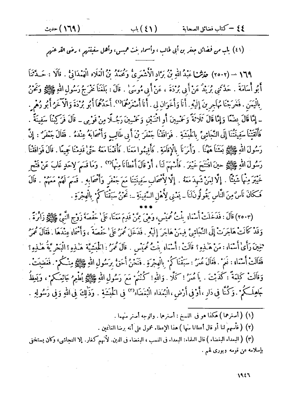 (٢٥٠٣) قَالَ فَدَخَلَتْ أَسْمَاءُ بِنْتُ عُمَيْسٍ، وَهِيَ مِمَّنْ قَدِمَ مَعَنَا، عَلَى حَفْصَةَ زَوْجِ النَّبِيِّ صَلَّى اللهُ عَلَيْهِ وَسَلَّمَ زَائِرَةً، وَقَدْ كَانَتْ هَاجَرَتْ إِلَى النَّجَاشِيِّ فِيمَنْ هَاجَرَ إِلَيْهِ، فَدَخَلَ عُمَرُ عَلَى حَفْصَةَ، وَأَسْمَاءُ عِنْدَهَا، فَقَالَ عُمَرُ حِينَ رَأَى أَسْمَاءَ: مَنْ هَذِهِ؟ قَالَتْ: أَسْمَاءُ بِنْتُ عُمَيْسٍ، قَالَ عُمَرُ: الْحَبَشِيَّةُ هَذِهِ؟ الْبَحْرِيَّةُ هَذِهِ؟ فَقَالَتْ أَسْمَاءُ: نَعَمْ، فَقَالَ عُمَرُ: سَبَقْنَاكُمْ بِالْهِجْرَةِ، فَنَحْنُ أَحَقُّ بِرَسُولِ اللهِ صَلَّى اللهُ عَلَيْهِ وَسَلَّمَ مِنْكُمْ، فَغَضِبَتْ، وَقَالَتْ كَلِمَةً: كَذَبْتَ يَا عُمَرُ كَلَّا، وَاللهِ كُنْتُمْ مَعَ رَسُولِ اللهِ صَلَّى اللهُ عَلَيْهِ وَسَلَّمَ يُطْعِمُ جَائِعَكُمْ، وَيَعِظُ جَاهِلَكُمْ، وَكُنَّا فِي دَارِ، أَوْ فِي أَرْضِ الْبُعَدَاءِ الْبُغَضَاءِ فِي الْحَبَشَةِ، وَذَلِكَ فِي اللهِ وَفِي رَسُولِهِ، وَايْمُ اللهِ لَا أَطْعَمُ طَعَامًا وَلَا أَشْرَبُ شَرَابًا حَتَّى أَذْكُرَ مَا قُلْتَ لِرَسُولِ اللهِ صَلَّى اللهُ عَلَيْهِ وَسَلَّمَ، وَنَحْنُ كُنَّا نُؤْذَى وَنُخَافُ، وَسَأَذْكُرُ ذَلِكَ لِرَسُولِ اللهِ صَلَّى اللهُ عَلَيْهِ وَسَلَّمَ وَأَسْأَلُهُ، وَوَاللهِ لَا أَكْذِبُ وَلَا أَزِيغُ وَلَا أَزِيدُ عَلَى ذَلِكَ، قَالَ: فَلَمَّا جَاءَ النَّبِيُّ صَلَّى اللهُ عَلَيْهِ وَسَلَّمَ قَالَتْ: يَا نَبِيَّ اللهِ إِنَّ عُمَرَ قَالَ: كَذَا وَكَذَا، فَقَالَ رَسُولُ اللهِ صَلَّى اللهُ عَلَيْهِ وَسَلَّمَ: «لَيْسَ بِأَحَقَّ بِي مِنْكُمْ، وَلَهُ وَلِأَصْحَابِهِ هِجْرَةٌ وَاحِدَةٌ، وَلَكُمْ أَنْتُمْ، أَهْلَ السَّفِينَةِ، هِجْرَتَانِ» قَالَتْ: فَلَقَدْ رَأَيْتُ أَبَا مُوسَى وَأَصْحَابَ السَّفِينَةِ يَأْتُونِي أَرْسَالًا، يَسْأَلُونِي عَنْ هَذَا الْحَدِيثِ، مَا مِنَ الدُّنْيَا شَيْءٌ هُمْ بِهِ أَفْرَحُ وَلَا أَعْظَمُ فِي أَنْفُسِهِمْ مِمَّا قَالَ لَهُمْ رَسُولُ اللهِ صَلَّى اللهُ عَلَيْهِ وَسَلَّمَ. قَالَ أَبُو بُرْدَةَ: فَقَالَتْ أَسْمَاءُ: فَلَقَدْ رَأَيْتُ أَبَا مُوسَى، وَإِنَّهُ لَيَسْتَعِيدُ هَذَا الْحَدِيثَ مِنِّي
