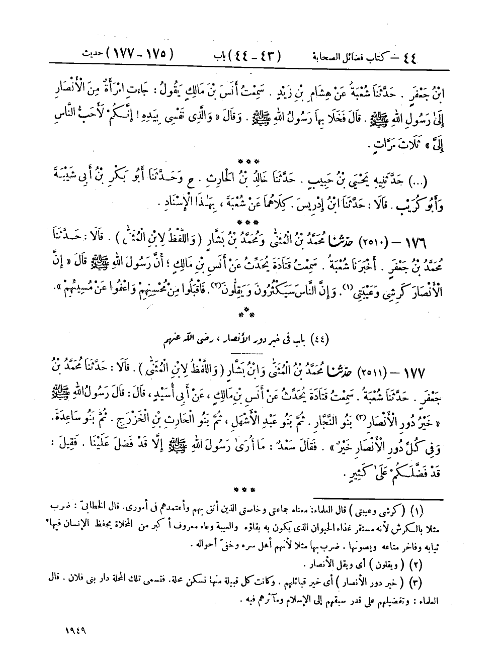 ١٧٧ - (٢٥١١) حَدَّثَنَا مُحَمَّدُ بْنُ الْمُثَنَّى، وَابْنُ بَشَّارٍ - وَاللَّفْظُ لِابْنِ الْمُثَنَّى قَالَا: حَدَّثَنَا مُحَمَّدُ بْنُ جَعْفَرٍ، حَدَّثَنَا شُعْبَةُ، سَمِعْتُ قَتَادَةَ، يُحَدِّثُ عَنْ أَنَسِ بْنِ مَالِكٍ، عَنْ أَبِي أُسَيْدٍ، قَالَ: قَالَ رَسُولُ اللهِ صَلَّى اللهُ عَلَيْهِ وَسَلَّمَ: «خَيْرُ دُورِ الْأَنْصَارِ بَنُو النَّجَّارِ، ثُمَّ بَنُو عَبْدِ الْأَشْهَلِ، ثُمَّ بَنُو الْحَارِثِ بْنِ الْخَزْرَجِ، ثُمَّ بَنُو سَاعِدَةَ وَفِي كُلِّ دُورِ الْأَنْصَارِ خَيْرٌ» فَقَالَ سَعْدٌ: مَا أَرَى رَسُولَ اللهِ صَلَّى اللهُ عَلَيْهِ وَسَلَّمَ إِلَّا قَدْ فَضَّلَ عَلَيْنَا، فَقِيلَ: قَدْ فَضَّلَكُمْ عَلَى كَثِيرٍ