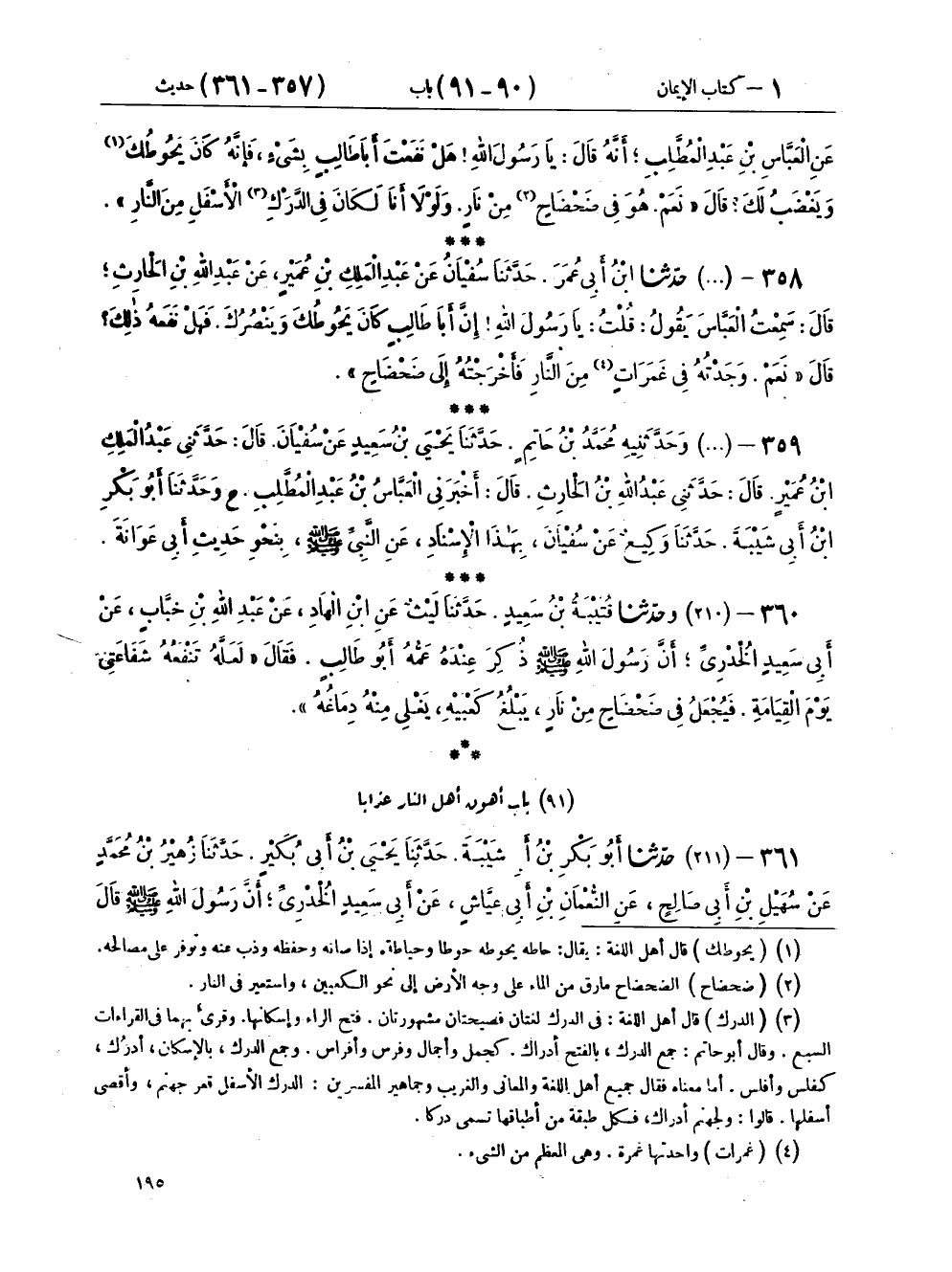 ٣٥٨ - (٢٠٩) حَدَّثَنَا ابْنُ أَبِي عُمَرَ، حَدَّثَنَا سُفْيَانُ، عَنْ عَبْدِ الْمَلِكِ بْنِ عُمَيْرٍ، عَنْ عَبْدِ اللهِ بْنِ الْحَارِثِ، قَالَ: سَمِعْتُ الْعَبَّاسَ، يَقُولُ: قُلْتُ: يَا رَسُولَ اللهِ، إِنَّ أَبَا طَالِبٍ كَانَ يَحُوطُكَ وَيَنْصُرُكَ فَهَلْ نَفَعَهُ ذَلِكَ؟ قَالَ: «نَعَمْ، وَجَدْتُهُ فِي غَمَرَاتٍ مِنَ النَّارِ، فَأَخْرَجْتُهُ إِلَى ضَحْضَاحٍ».