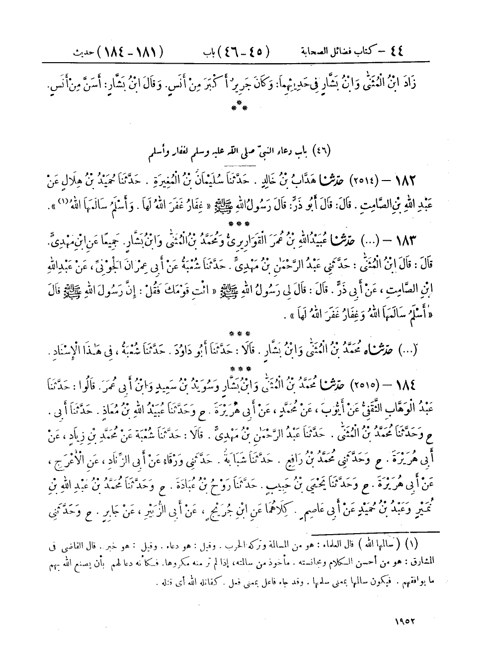 ١٨٤ - (٢٥١٥) حَدَّثَنَا مُحَمَّدُ بْنُ الْمُثَنَّى، وَابْنُ بَشَّارٍ وَسُوَيْدُ بْنُ سَعِيدٍ، وَابْنُ أَبِي عُمَرَ، قَالُوا: حَدَّثَنَا عَبْدُ الْوَهَّابِ الثَّقَفِيُّ، عَنْ أَيُّوبَ، عَنْ مُحَمَّدٍ، عَنْ أَبِي هُرَيْرَةَ، ح وَحَدَّثَنَا عُبَيْدُ اللهِ بْنُ مُعَاذٍ، حَدَّثَنَا أَبِي، ح وَحَدَّثَنَا مُحَمَّدُ بْنُ الْمُثَنَّى، حَدَّثَنَا عَبْدُ الرَّحْمَنِ بْنُ مَهْدِيٍّ، قَالَا: حَدَّثَنَا شُعْبَةُ، عَنْ مُحَمَّدِ بْنِ زِيَادٍ، عَنْ أَبِي هُرَيْرَةَ، ح وحَدَّثَنِي مُحَمَّدُ بْنُ رَافِعٍ، حَدَّثَنَا شَبَابَةُ، حَدَّثَنِي وَرْقَاءُ، عَنْ أَبِي الزِّنَادِ، عَنِ الْأَعْرَجِ، عَنْ أَبِي هُرَيْرَةَ، ح وَحَدَّثَنَا يَحْيَى بْنُ حَبِيبٍ، حَدَّثَنَا رَوْحُ بْنُ عُبَادَةَ، ح وَحَدَّثَنَا مُحَمَّدُ بْنُ عَبْدِ اللهِ بْنِ نُمَيْرٍ، وَعَبْدُ بْنُ حُمَيْدٍ، عَنْ أَبِي عَاصِمٍ، كِلَاهُمَا عَنِ ابْنِ جُرَيْجٍ، عَنْ أَبِي الزُّبَيْرِ، عَنْ جَابِرٍ، ح وحَدَّثَنِي سَلَمَةُ بْنُ شَبِيبٍ، حَدَّثَنَا الْحَسَنُ بْنُ أَعْيَنَ، حَدَّثَنَا مَعْقِلٌ، عَنْ أَبِي الزُّبَيْرِ، عَنْ جَابِرٍ، كُلُّهُمْ قَالَ عَنِ النَّبِيِّ صَلَّى اللهُ عَلَيْهِ وَسَلَّمَ قَالَ: «أَسْلَمُ سَالَمَهَا اللهُ، وَغِفَارُ غَفَرَ اللهُ لَهَا»