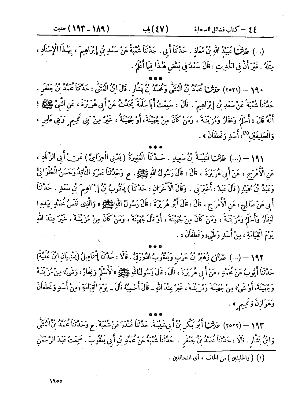١٩٠ - (٢٥٢١) حَدَّثَنَا مُحَمَّدُ بْنُ الْمُثَنَّى، وَمُحَمَّدُ بْنُ بَشَّارٍ، قَالَ: ابْنُ الْمُثَنَّى، حَدَّثَنَا مُحَمَّدُ بْنُ جَعْفَرٍ، حَدَّثَنَا شُعْبَةُ، عَنْ سَعْدِ بْنِ إِبْرَاهِيمَ، قَالَ: سَمِعْتُ أَبَا سَلَمَةَ، يُحَدِّثُ عَنْ أَبِي هُرَيْرَةَ، عَنِ النَّبِيِّ صَلَّى اللهُ عَلَيْهِ وَسَلَّمَ، أَنَّهُ قَالَ: «أَسْلَمُ، وَغِفَارُ، وَمُزَيْنَةُ، وَمَنْ كَانَ مِنْ جُهَيْنَةَ، أَوْ جُهَيْنَةُ، خَيْرٌ مِنْ بَنِي تَمِيمٍ، وَبَنِي عَامِرٍ، وَالْحَلِيفَيْنِ أَسَدٍ، وَغَطَفَانَ»