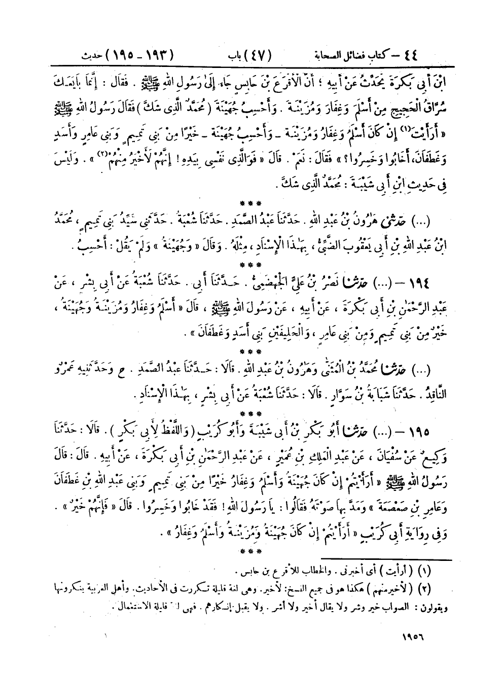 ١٩٥ - (٢٥٢٢) حَدَّثَنَا أَبُو بَكْرِ بْنُ أَبِي شَيْبَةَ، وَأَبُو كُرَيْبٍ - وَاللَّفْظُ لِأَبِي بَكْرٍ - قَالَا: حَدَّثَنَا وَكِيعٌ، عَنْ سُفْيَانَ، عَنْ عَبْدِ الْمَلِكِ بْنِ عُمَيْرٍ، عَنْ عَبْدِ الرَّحْمَنِ بْنِ أَبِي بَكْرَةَ، عَنْ أَبِيهِ، قَالَ: قَالَ رَسُولُ اللهِ صَلَّى اللهُ عَلَيْهِ وَسَلَّمَ: «أَرَأَيْتُمْ إِنْ كَانَ جُهَيْنَةُ، وَأَسْلَمُ، وَغِفَارُ، خَيْرًا مِنْ بَنِي تَمِيمٍ، وَبَنِي عَبْدِ اللهِ بْنِ غَطَفَانَ، وَعَامِرِ بْنِ صَعْصَعَةَ» وَمَدَّ بِهَا صَوْتَهُ فَقَالُوا: يَا رَسُولَ اللهِ فَقَدْ خَابُوا وَخَسِرُوا، قَالَ: «فَإِنَّهُمْ خَيْرٌ» وَفِي رِوَايَةِ أَبِي كُرَيْبٍ «أَرَأَيْتُمْ إِنْ كَانَ جُهَيْنَةُ، وَمُزَيْنَةُ، وَأَسْلَمُ، وَغِفَارُ»