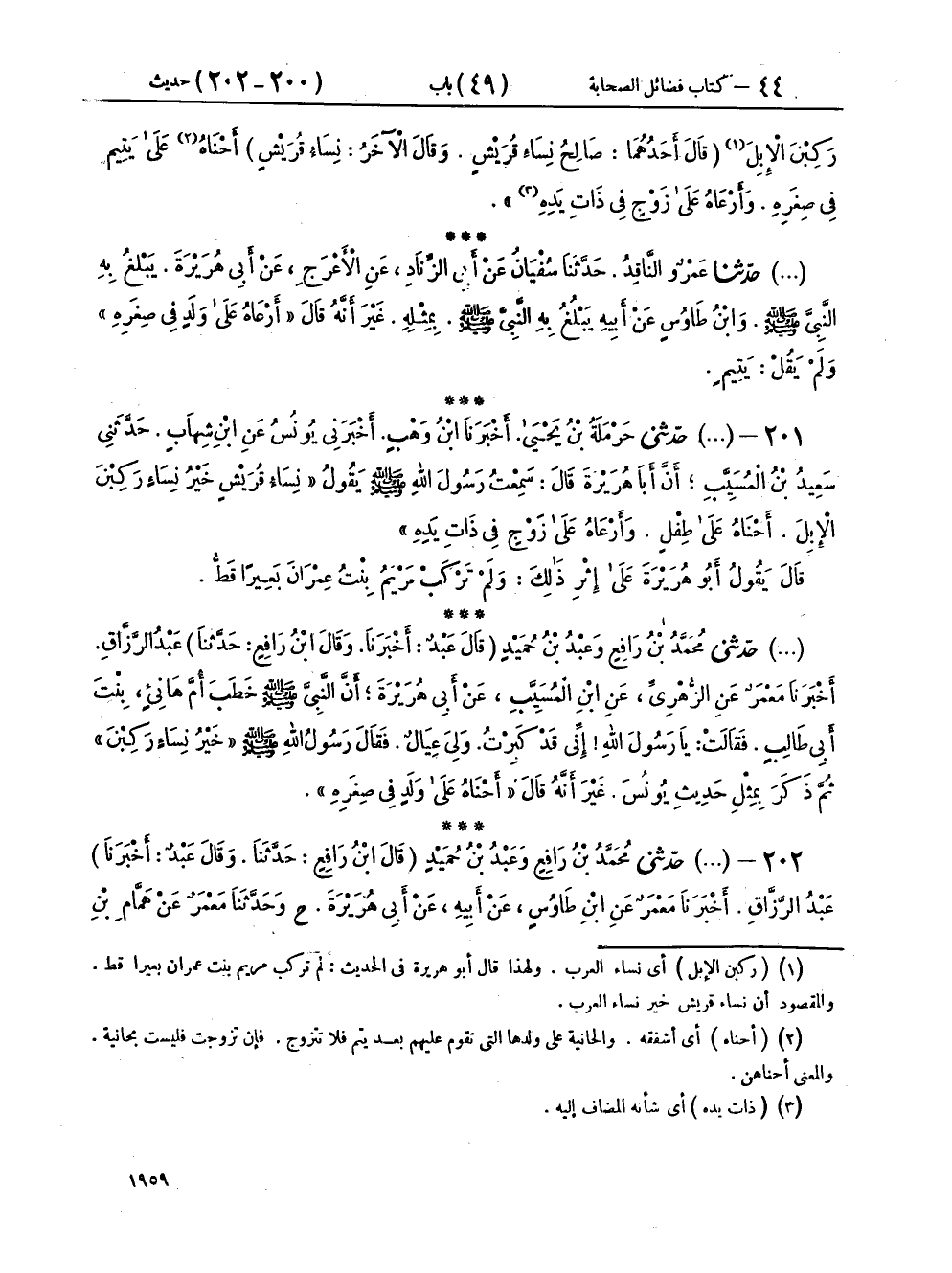 ٢٠٢ - (٢٥٢٧) حَدَّثَنِي مُحَمَّدُ بْنُ رَافِعٍ، وَعَبْدُ بْنُ حُمَيْدٍ - قَالَ ابْنُ رَافِعٍ: حَدَّثَنَا، وقَالَ عَبْدٌ: أَخْبَرَنَا - عَبْدُ الرَّزَّاقِ، أَخْبَرَنَا مَعْمَرٌ، عَنِ ابْنِ طَاوُسٍ، عَنْ أَبِيهِ، عَنْ أَبِي هُرَيْرَةَ، ح وَحَدَّثَنَا مَعْمَرٌ، عَنْ هَمَّامِ بْنِ مُنَبِّهٍ، عَنْ أَبِي هُرَيْرَةَ، قَالَ: قَالَ رَسُولُ اللهِ صَلَّى اللهُ عَلَيْهِ وَسَلَّمَ: «خَيْرُ نِسَاءٍ رَكِبْنَ الْإِبِلَ، صَالِحُ نِسَاءِ قُرَيْشٍ أَحْنَاهُ عَلَى وَلَدٍ فِي صِغَرِهِ، وَأَرْعَاهُ عَلَى زَوْجٍ فِي ذَاتِ يَدِهِ»