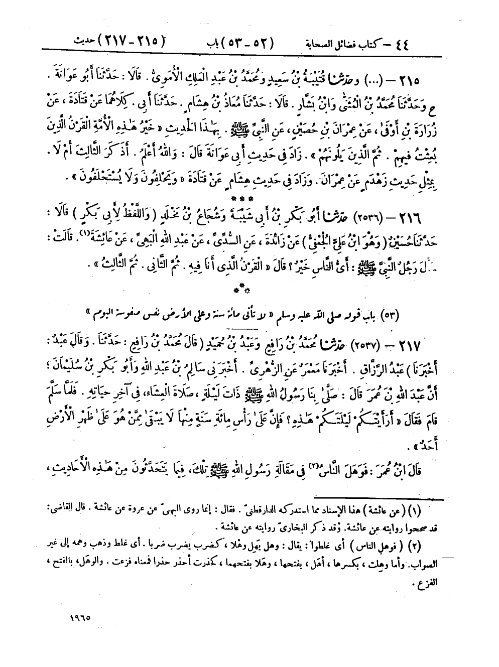 ٢١٥ - (٢٥٣٥) وَحَدَّثَنَا قُتَيْبَةُ بْنُ سَعِيدٍ، وَمُحَمَّدُ بْنُ عَبْدِ الْمَلِكِ الْأُمَوِيُّ، قَالَا: حَدَّثَنَا أَبُو عَوَانَةَ، ح وَحَدَّثَنَا مُحَمَّدُ بْنُ الْمُثَنَّى، وَابْنُ بَشَّارٍ، قَالَا: حَدَّثَنَا مُعَاذُ بْنُ هِشَامٍ، حَدَّثَنَا أَبِي، كِلَاهُمَا عَنْ قَتَادَةَ، عَنْ زُرَارَةَ بْنِ أَوْفَى، عَنْ عِمْرَانَ بْنِ حُصَيْنٍ، عَنِ النَّبِيِّ صَلَّى اللهُ عَلَيْهِ وَسَلَّمَ، بِهَذَا الْحَدِيثِ «خَيْرُ هَذِهِ الْأُمَّةِ الْقَرْنُ الَّذِينَ بُعِثْتُ فِيهِمْ، ثُمَّ الَّذِينَ يَلُونَهُمْ» زَادَ فِي حَدِيثِ أَبِي عَوَانَةَ، قَالَ: وَاللهُ أَعْلَمُ، أَذَكَرَ الثَّالِثَ أَمْ لَا، بِمِثْلِ حَدِيثِ زَهْدَمٍ، عَنْ عِمْرَانَ، وَزَادَ فِي حَدِيثِ هِشَامٍ، عَنْ قَتَادَةَ «وَيَحْلِفُونَ وَلَا يُسْتَحْلَفُونَ»