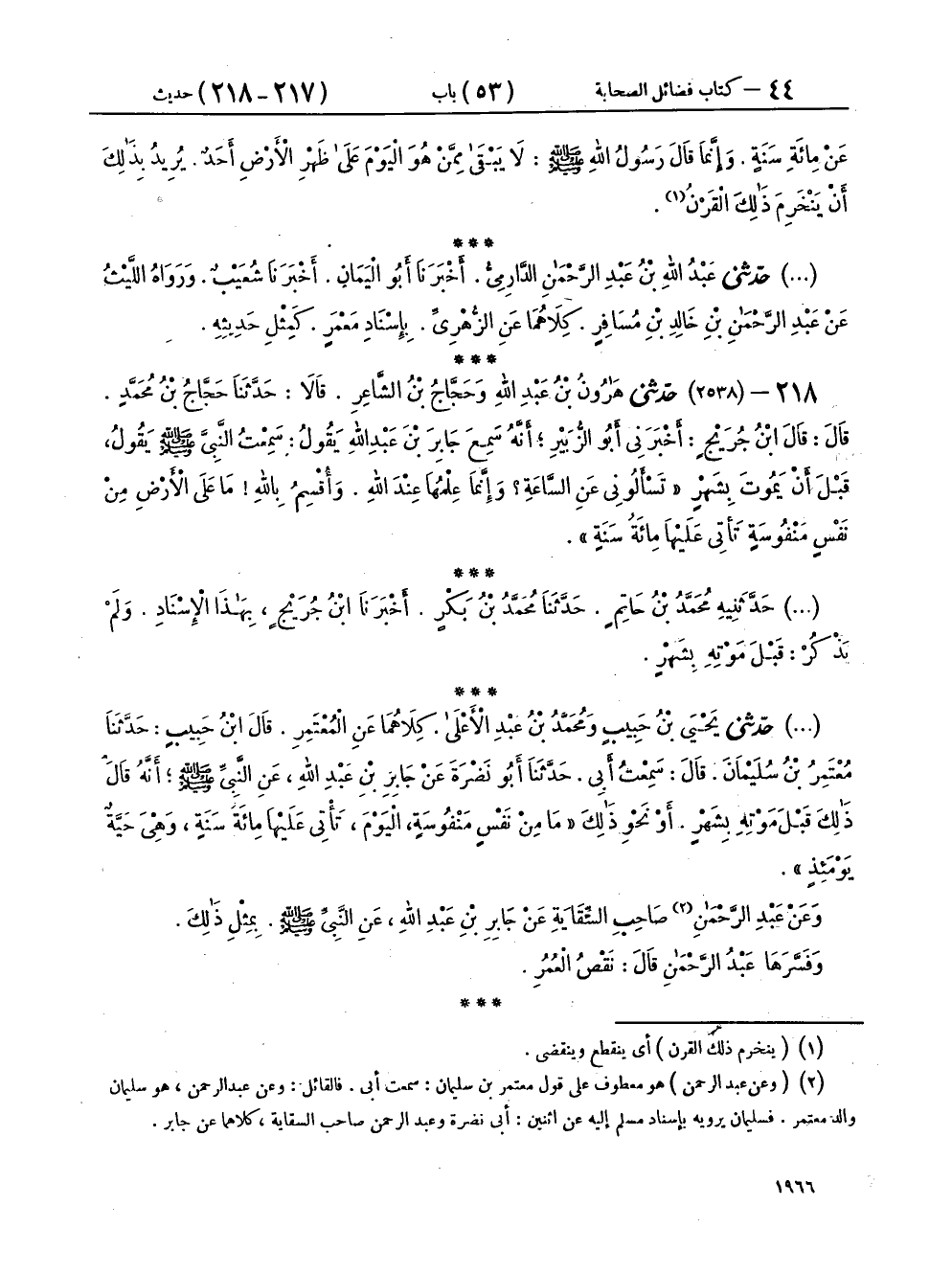 ٢١٨ - حَدَّثَنِي يَحْيَى بْنُ حَبِيبٍ، وَمُحَمَّدُ بْنُ عَبْدِ الْأَعْلَى، كِلَاهُمَا عَنِ الْمُعْتَمِرِ، قَالَ ابْنُ حَبِيبٍ: حَدَّثَنَا مُعْتَمِرُ بْنُ سُلَيْمَانَ، قَالَ: سَمِعْتُ أَبِي، حَدَّثَنَا أَبُو نَضْرَةَ، عَنْ جَابِرِ بْنِ عَبْدِ اللهِ، عَنِ النَّبِيِّ صَلَّى اللهُ عَلَيْهِ وَسَلَّمَ، أَنَّهُ قَالَ ذَلِكَ قَبْلَ مَوْتِهِ بِشَهْرٍ أَوْ نَحْوِ ذَلِكَ: «مَا مِنْ نَفْسٍ مَنْفُوسَةٍ الْيَوْمَ، تَأْتِي عَلَيْهَا مِائَةُ سَنَةٍ، وَهِيَ حَيَّةٌ يَوْمَئِذٍ» وَعَنْ عَبْدِ الرَّحْمَنِ، صَاحِبِ السِّقَايَةِ، عَنْ جَابِرِ بْنِ عَبْدِ اللهِ، عَنِ النَّبِيِّ صَلَّى اللهُ عَلَيْهِ وَسَلَّمَ، بِمِثْلِ ذَلِكَ. وَفَسَّرَهَا عَبْدُ الرَّحْمَنِ قَالَ: نَقْصُ الْعُمُرِ.