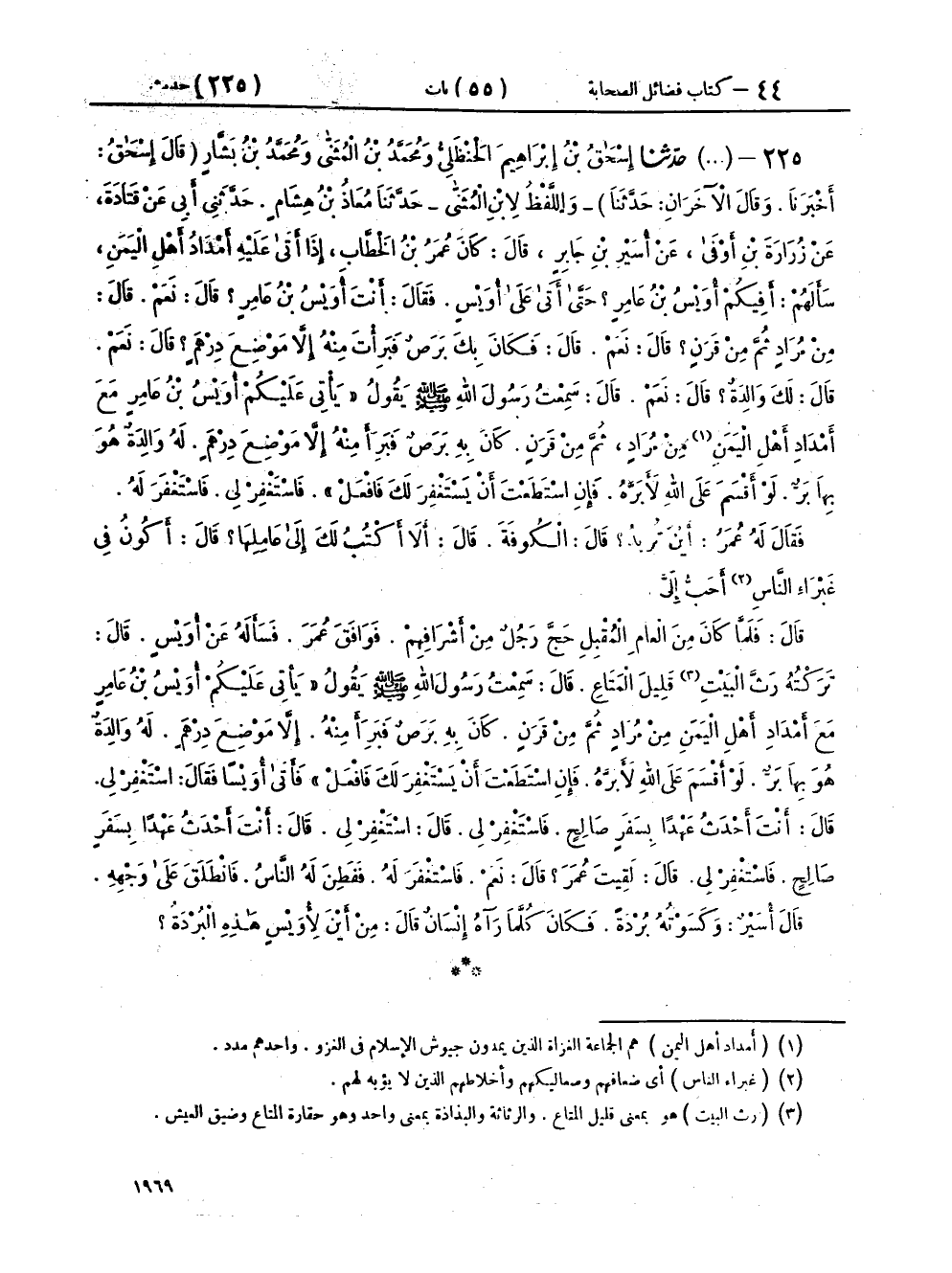 ٢٢٥ - (٢٥٤٢) حَدَّثَنَا إِسْحَاقُ بْنُ إِبْرَاهِيمَ الْحَنْظَلِيُّ، وَمُحَمَّدُ بْنُ الْمُثَنَّى، وَمُحَمَّدُ بْنُ بَشَّارٍ، - قَالَ إِسْحَاقُ أَخْبَرَنَا، وقَالَ الْآخَرَانِ: حَدَّثَنَا وَاللَّفْظُ لِابْنِ الْمُثَنَّى - حَدَّثَنَا مُعَاذُ بْنُ هِشَامٍ، حَدَّثَنِي أَبِي، عَنْ قَتَادَةَ، عَنْ زُرَارَةَ بْنِ أَوْفَى، عَنْ أُسَيْرِ بْنِ جَابِرٍ، قَالَ: كَانَ عُمَرُ بْنُ الْخَطَّابِ إِذَا أَتَى عَلَيْهِ أَمْدَادُ أَهْلِ الْيَمَنِ، سَأَلَهُمْ: أَفِيكُمْ أُوَيْسُ بْنُ عَامِرٍ؟ حَتَّى أَتَى عَلَى أُوَيْسٍ فَقَالَ: أَنْتَ أُوَيْسُ بْنُ عَامِرٍ؟ قَالَ: نَعَمْ، قَالَ: مِنْ مُرَادٍ ثُمَّ مِنْ قَرَنٍ؟ قَالَ: نَعَمْ، قَالَ: فَكَانَ بِكَ بَرَصٌ فَبَرَأْتَ مِنْهُ إِلَّا مَوْضِعَ دِرْهَمٍ؟ قَالَ: نَعَمْ، قَالَ: لَكَ وَالِدَةٌ؟ قَالَ: نَعَمْ، قَالَ سَمِعْتُ رَسُولَ اللهِ صَلَّى اللهُ عَلَيْهِ وَسَلَّمَ، يَقُولُ: «يَأْتِي عَلَيْكُمْ أُوَيْسُ بْنُ عَامِرٍ مَعَ أَمْدَادِ أَهْلِ الْيَمَنِ، مِنْ مُرَادٍ، ثُمَّ مِنْ قَرَنٍ، كَانَ بِهِ بَرَصٌ فَبَرَأَ مِنْهُ إِلَّا مَوْضِعَ دِرْهَمٍ، لَهُ وَالِدَةٌ هُوَ بِهَا بَرٌّ، لَوْ أَقْسَمَ عَلَى اللهِ لَأَبَرَّهُ، فَإِنِ اسْتَطَعْتَ أَنْ يَسْتَغْفِرَ لَكَ فَافْعَلْ» فَاسْتَغْفِرْ لِي، فَاسْتَغْفَرَ لَهُ، فَقَالَ لَهُ عُمَرُ: أَيْنَ تُرِيدُ؟ قَالَ: الْكُوفَةَ، قَالَ: أَلَا أَكْتُبُ لَكَ إِلَى عَامِلِهَا؟ قَالَ: أَكُونُ فِي غَبْرَاءِ النَّاسِ أَحَبُّ إِلَيَّ. قَالَ: فَلَمَّا كَانَ مِنَ الْعَامِ الْمُقْبِلِ حَجَّ رَجُلٌ مِنْ أَشْرَافِهِمْ، فَوَافَقَ عُمَرَ، فَسَأَلَهُ عَنْ أُوَيْسٍ، قَالَ: تَرَكْتُهُ رَثَّ الْبَيْتِ، قَلِيلَ الْمَتَاعِ، قَالَ: سَمِعْتُ رَسُولَ اللهِ صَلَّى اللهُ عَلَيْهِ وَسَلَّمَ، يَقُولُ: «يَأْتِي عَلَيْكُمْ أُوَيْسُ بْنُ عَامِرٍ مَعَ أَمْدَادِ أَهْلِ الْيَمَنِ مِنْ مُرَادٍ، ثُمَّ مِنْ قَرَنٍ، كَانَ بِهِ بَرَصٌ فَبَرَأَ مِنْهُ، إِلَّا مَوْضِعَ دِرْهَمٍ لَهُ وَالِدَةٌ هُوَ بِهَا بَرٌّ، لَوْ أَقْسَمَ عَلَى اللهِ لَأَبَرَّهُ، فَإِنِ اسْتَطَعْتَ أَنْ يَسْتَغْفِرَ لَكَ فَافْعَلْ» فَأَتَى أُوَيْسًا فَقَالَ: اسْتَغْفِرْ لِي، قَالَ: أَنْتَ أَحْدَثُ عَهْدًا بِسَفَرٍ صَالِحٍ، فَاسْتَغْفِرْ لِي، قَالَ: اسْتَغْفِرْ لِي، قَالَ: أَنْتَ أَحْدَثُ عَهْدًا بِسَفَرٍ صَالِحٍ، فَاسْتَغْفِرْ لِي، قَالَ: لَقِيتَ عُمَرَ؟ قَالَ: نَعَمْ، فَاسْتَغْفَرَ لَهُ، فَفَطِنَ لَهُ النَّاسُ، فَانْطَلَقَ عَلَى وَجْهِهِ، قَالَ أُسَيْرٌ: وَكَسَوْتُهُ بُرْدَةً، فَكَانَ كُلَّمَا رَآهُ إِنْسَانٌ قَالَ: مِنْ أَيْنَ لِأُوَيْسٍ هَذِهِ الْبُرْدَةُ