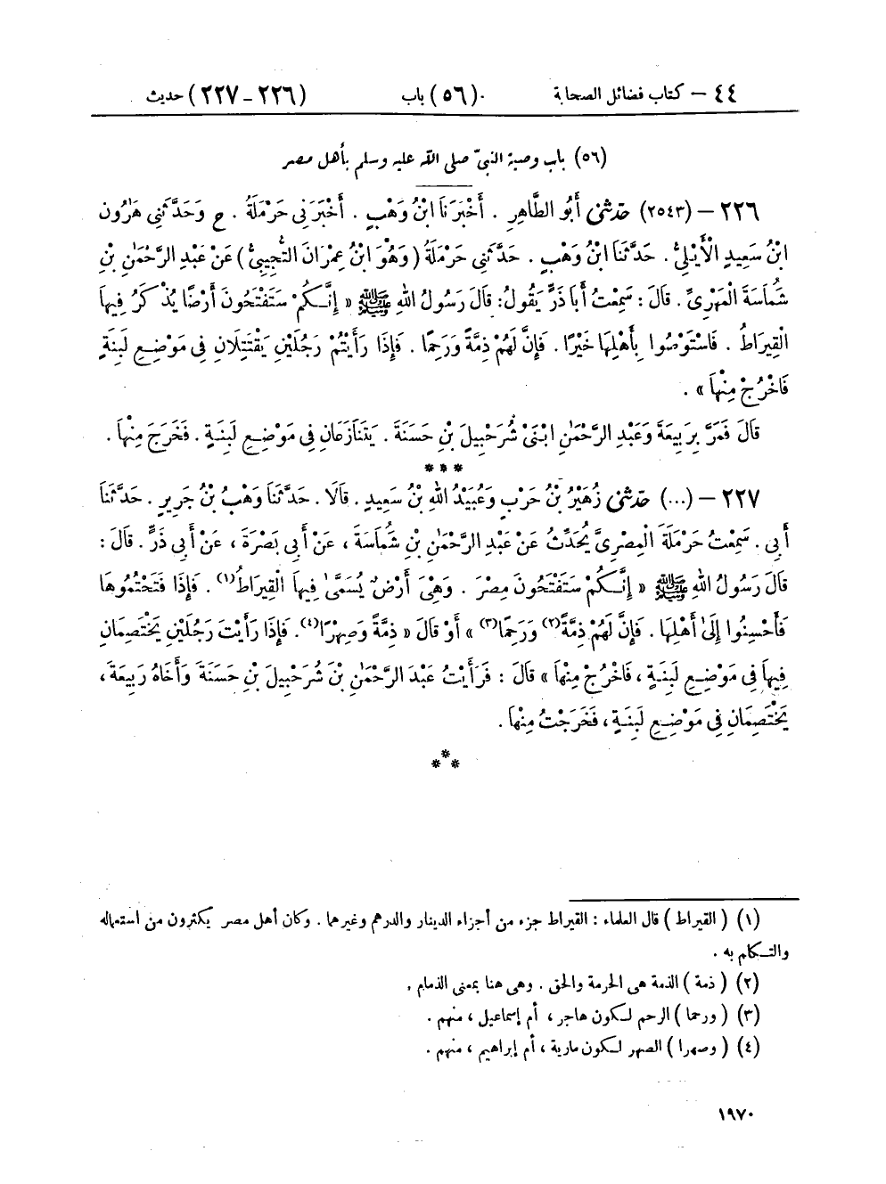 ٢٢٧ - (٢٥٤٣) حَدَّثَنِي زُهَيْرُ بْنُ حَرْبٍ، وَعُبَيْدُ اللهِ بْنُ سَعِيدٍ، قَالَا: حَدَّثَنَا وَهْبُ بْنُ جَرِيرٍ، حَدَّثَنَا أَبِي، سَمِعْتُ حَرْمَلَةَ الْمِصْرِيَّ، يُحَدِّثُ عَنْ عَبْدِ الرَّحْمَنِ بْنِ شِمَاسَةَ، عَنْ أَبِي بَصْرَةَ، عَنْ أَبِي ذَرٍّ، قَالَ: قَالَ رَسُولُ اللهِ صَلَّى اللهُ عَلَيْهِ وَسَلَّمَ: «إِنَّكُمْ سَتَفْتَحُونَ مِصْرَ وَهِيَ أَرْضٌ يُسَمَّى فِيهَا الْقِيرَاطُ، فَإِذَا فَتَحْتُمُوهَا فَأَحْسِنُوا إِلَى أَهْلِهَا، فَإِنَّ لَهُمْ ذِمَّةً وَرَحِمًا» أَوْ قَالَ «ذِمَّةً وَصِهْرًا، فَإِذَا رَأَيْتَ رَجُلَيْنِ يَخْتَصِمَانِ فِيهَا فِي مَوْضِعِ لَبِنَةٍ، فَاخْرُجْ مِنْهَا» قَالَ: فَرَأَيْتُ عَبْدَ الرَّحْمَنِ بْنَ شُرَحْبِيلَ بْنِ حَسَنَةَ، وَأَخَاهُ رَبِيعَةَ يَخْتَصِمَانِ فِي مَوْضِعِ لَبِنَةٍ فَخَرَجْتُ مِنْهَا