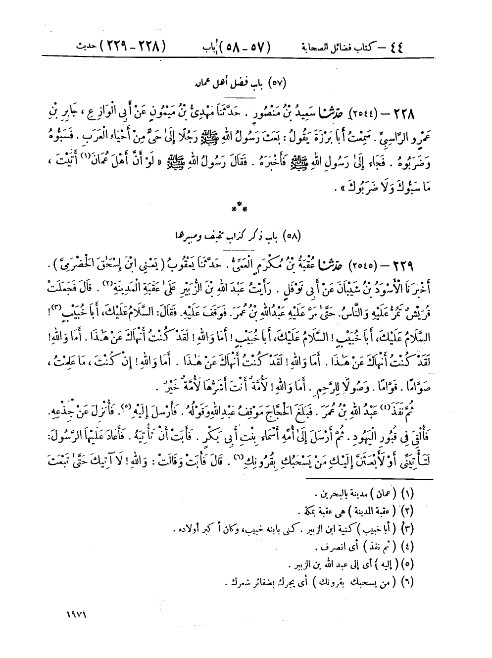 ٢٢٩ - (٢٥٤٥) حَدَّثَنَا عُقْبَةُ بْنُ مُكْرَمٍ الْعَمِّيُّ، حَدَّثَنَا يَعْقُوبُ يَعْنِي ابْنَ إِسْحَاقَ الْحَضْرَمِيَّ، أَخْبَرَنَا الْأَسْوَدُ بْنُ شَيْبَانَ، عَنْ أَبِي نَوْفَلٍ، رَأَيْتُ عَبْدَ اللهِ بْنَ الزُّبَيْرِ عَلَى عَقَبَةِ الْمَدِينَةِ، قَالَ: فَجَعَلَتْ قُرَيْشٌ تَمُرُّ عَلَيْهِ، وَالنَّاسُ حَتَّى مَرَّ عَلَيْهِ عَبْدُ اللهِ بْنُ عُمَرَ، فَوَقَفَ عَلَيْهِ فَقَالَ: السَّلَامُ عَلَيْكَ، أَبَا خُبَيْبٍ السَّلَامُ عَلَيْكَ أَبَا خُبَيْبٍ السَّلَامُ عَلَيْكَ أَبَا خُبَيْبٍ أَمَا وَاللهِ لَقَدْ كُنْتُ أَنْهَاكَ عَنْ هَذَا، أَمَا وَاللهِ لَقَدْ كُنْتُ أَنْهَاكَ عَنْ هَذَا، أَمَا وَاللهِ لَقَدْ كُنْتُ أَنْهَاكَ عَنْ هَذَا، أَمَا وَاللهِ إِنْ كُنْتَ، مَا عَلِمْتُ، صَوَّامًا، قَوَّامًا، وَصُولًا لِلرَّحِمِ، أَمَا وَاللهِ لَأُمَّةٌ أَنْتَ أَشَرُّهَا لَأُمَّةٌ خَيْرٌ، ثُمَّ نَفَذَ عَبْدُ اللهِ بْنُ عُمَرَ، فَبَلَغَ الْحَجَّاجَ مَوْقِفُ عَبْدِ اللهِ وَقَوْلُهُ، فَأَرْسَلَ إِلَيْهِ، فَأُنْزِلَ عَنْ جِذْعِهِ، فَأُلْقِيَ فِي قُبُورِ الْيَهُودِ، ثُمَّ أَرْسَلَ إِلَى أُمِّهِ أَسْمَاءَ بِنْتِ أَبِي بَكْرٍ، فَأَبَتْ أَنْ تَأْتِيَهُ، فَأَعَادَ عَلَيْهَا الرَّسُولَ: لَتَأْتِيَنِّي أَوْ لَأَبْعَثَنَّ إِلَيْكِ مَنْ يَسْحَبُكِ بِقُرُونِكِ، قَالَ: فَأَبَتْ وَقَالَتْ: وَاللهِ لَا آتِيكَ حَتَّى تَبْعَثَ إِلَيَّ مَنْ يَسْحَبُنِي بِقُرُونِي، قَالَ: فَقَالَ: أَرُونِي سِبْتَيَّ فَأَخَذَ نَعْلَيْهِ، ثُمَّ انْطَلَقَ يَتَوَذَّفُ، حَتَّى دَخَلَ عَلَيْهَا، فَقَالَ: كَيْفَ رَأَيْتِنِي صَنَعْتُ بِعَدُوِّ اللهِ؟ قَالَتْ: رَأَيْتُكَ أَفْسَدْتَ عَلَيْهِ دُنْيَاهُ، وَأَفْسَدَ عَلَيْكَ آخِرَتَكَ، بَلَغَنِي أَنَّكَ تَقُولُ لَهُ: يَا ابْنَ ذَاتِ النِّطَاقَيْنِ أَنَا، وَاللهِ ذَاتُ النِّطَاقَيْنِ، أَمَّا أَحَدُهُمَا فَكُنْتُ أَرْفَعُ بِهِ طَعَامَ رَسُولِ اللهِ صَلَّى اللهُ عَلَيْهِ وَسَلَّمَ، وَطَعَامَ أَبِي بَكْرٍ مِنَ الدَّوَابِّ، وَأَمَّا الْآخَرُ فَنِطَاقُ الْمَرْأَةِ الَّتِي لَا تَسْتَغْنِي عَنْهُ، أَمَا إِنَّ رَسُولَ اللهِ صَلَّى اللهُ عَلَيْهِ وَسَلَّمَ حَدَّثَنَا، «أَنَّ فِي ثَقِيفٍ كَذَّابًا وَمُبِيرًا» فَأَمَّا الْكَذَّابُ فَرَأَيْنَاهُ، وَأَمَّا الْمُبِيرُ فَلَا إِخَالُكَ إِلَّا إِيَّاهُ، قَالَ: فَقَامَ عَنْهَا وَلَمْ يُرَاجِعْهَا