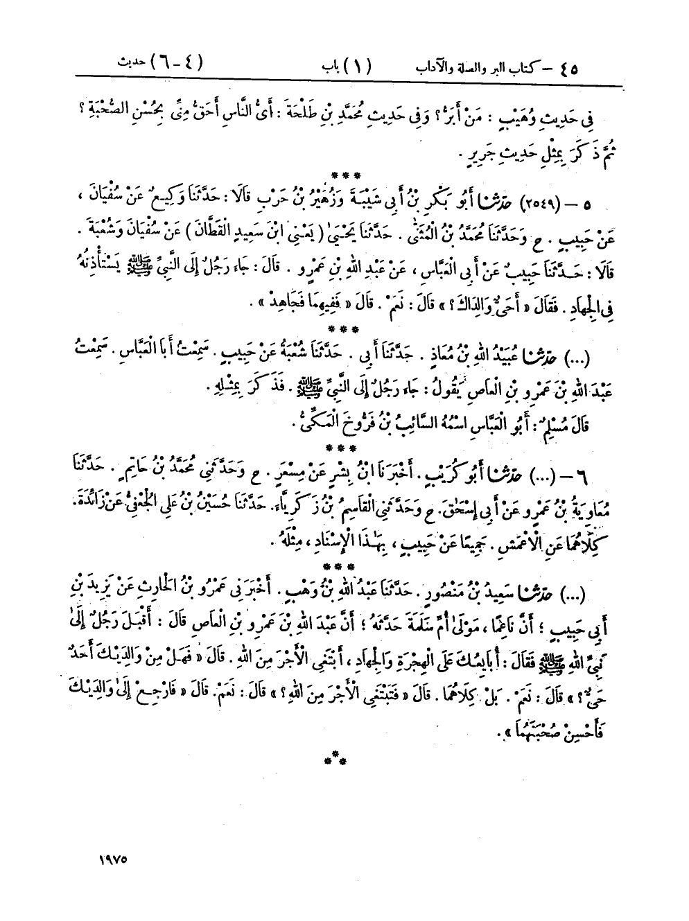 ٥ - (٢٥٤٩) حَدَّثَنَا أَبُو بَكْرِ بْنُ أَبِي شَيْبَةَ، وَزُهَيْرُ بْنُ حَرْبٍ، قَالَا: حَدَّثَنَا وَكِيعٌ، عَنْ سُفْيَانَ، عَنْ حَبِيبٍ، ح وَحَدَّثَنَا مُحَمَّدُ بْنُ الْمُثَنَّى، حَدَّثَنَا يَحْيَى يَعْنِي ابْنَ سَعِيدٍ الْقَطَّانَ، عَنْ سُفْيَانَ، وَشُعْبَةَ، قَالَا: حَدَّثَنَا حَبِيبٌ، عَنْ أَبِي الْعَبَّاسِ، عَنْ عَبْدِ اللهِ بْنِ عَمْرٍو، قَالَ: جَاءَ رَجُلٌ إِلَى النَّبِيِّ صَلَّى اللهُ عَلَيْهِ وَسَلَّمَ، يَسْتَأْذِنُهُ فِي الْجِهَادِ فَقَالَ: «أَحَيٌّ وَالِدَاكَ؟» قَالَ: نَعَمْ، قَالَ: «فَفِيهِمَا فَجَاهِدْ»