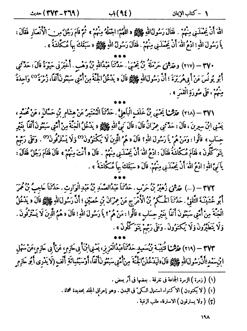 ٣٧٢ - (٢١٨) حَدَّثَنِي زُهَيْرُ بْنُ حَرْبٍ، حَدَّثَنَا عَبْدُ الصَّمَدِ بْنُ عَبْدِ الْوَارِثِ، حَدَّثَنَا حَاجِبُ بْنُ عُمَرَ أَبُو خُشَيْنَةَ الثَّقَفِيُّ، حَدَّثَنَا الْحَكَمُ بْنُ الْأَعْرَجِ، عَنْ عِمْرَانَ بْنِ حُصَيْنٍ، أَنَّ رَسُولَ اللهِ صَلَّى اللهُ عَلَيْهِ وَسَلَّمَ قَالَ: «يَدْخُلُ الْجَنَّةَ مِنْ أُمَّتِي سَبْعُونَ أَلْفًا بِغَيْرِ حِسَابٍ»، قَالُوا: مَنْ هُمْ يَا رَسُولَ اللهِ؟ قَالَ: «هُمُ الَّذِينَ لَا يَسْتَرْقُونَ، وَلَا يَتَطَيَّرُونَ، وَلَا يَكْتَوُونَ، وَعَلَى رَبِّهِمْ يَتَوَكَّلُونَ»