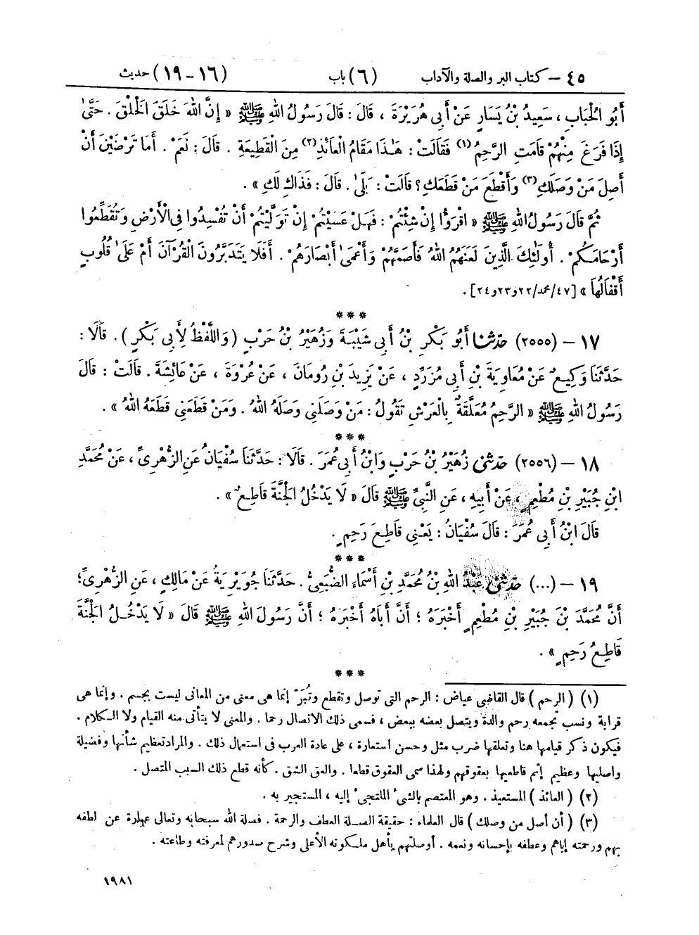 ١٨ - (٢٥٥٦) حَدَّثَنِي زُهَيْرُ بْنُ حَرْبٍ، وَابْنُ أَبِي عُمَرَ، قَالَا: حَدَّثَنَا سُفْيَانُ، عَنِ الزُّهْرِيِّ، عَنْ مُحَمَّدِ بْنِ جُبَيْرِ بْنِ مُطْعِمٍ، عَنْ أَبِيهِ، عَنِ النَّبِيِّ صَلَّى اللهُ عَلَيْهِ وَسَلَّمَ، قَالَ: «لَا يَدْخُلُ الْجَنَّةَ قَاطِعٌ» قَالَ ابْنُ أَبِي عُمَرَ: قَالَ سُفْيَانُ: يَعْنِي قَاطِعَ رَحِمٍ