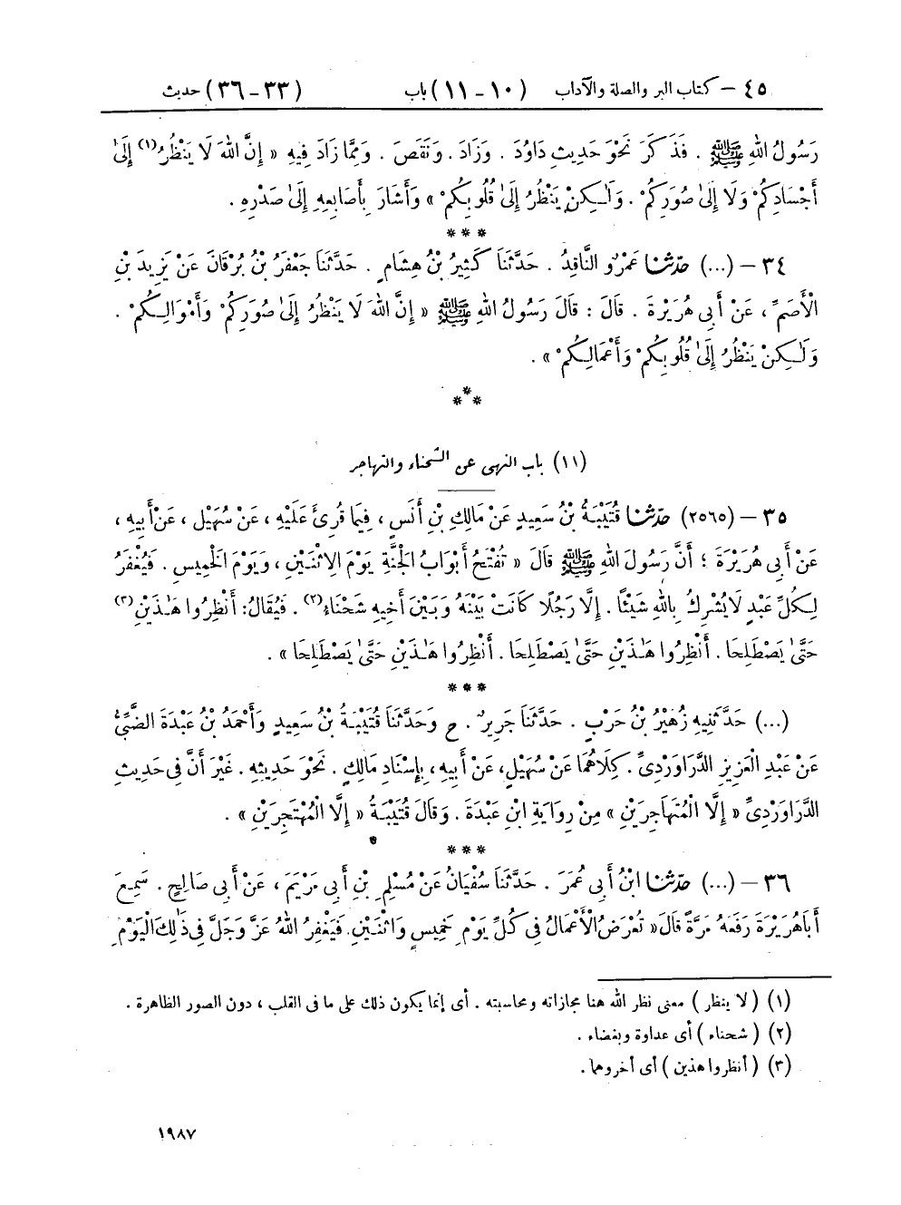 ٣٥ - (٢٥٦٥) حَدَّثَنَا قُتَيْبَةُ بْنُ سَعِيدٍ، عَنْ مَالِكِ بْنِ أَنَسٍ، فِيمَا قُرِئَ عَلَيْهِ، عَنْ سُهَيْلٍ، عَنْ أَبِيهِ، عَنْ أَبِي هُرَيْرَةَ، أَنَّ رَسُولَ اللهِ صَلَّى اللهُ عَلَيْهِ وَسَلَّمَ، قَالَ: " تُفْتَحُ أَبْوَابُ الْجَنَّةِ يَوْمَ الْإِثْنَيْنِ، وَيَوْمَ الْخَمِيسِ، فَيُغْفَرُ لِكُلِّ عَبْدٍ لَا يُشْرِكُ بِاللهِ شَيْئًا، إِلَّا رَجُلًا كَانَتْ بَيْنَهُ وَبَيْنَ أَخِيهِ شَحْنَاءُ، فَيُقَالُ: أَنْظِرُوا هَذَيْنِ حَتَّى يَصْطَلِحَا، أَنْظِرُوا هَذَيْنِ حَتَّى يَصْطَلِحَا، أَنْظِرُوا هَذَيْنِ حَتَّى يَصْطَلِحَا «