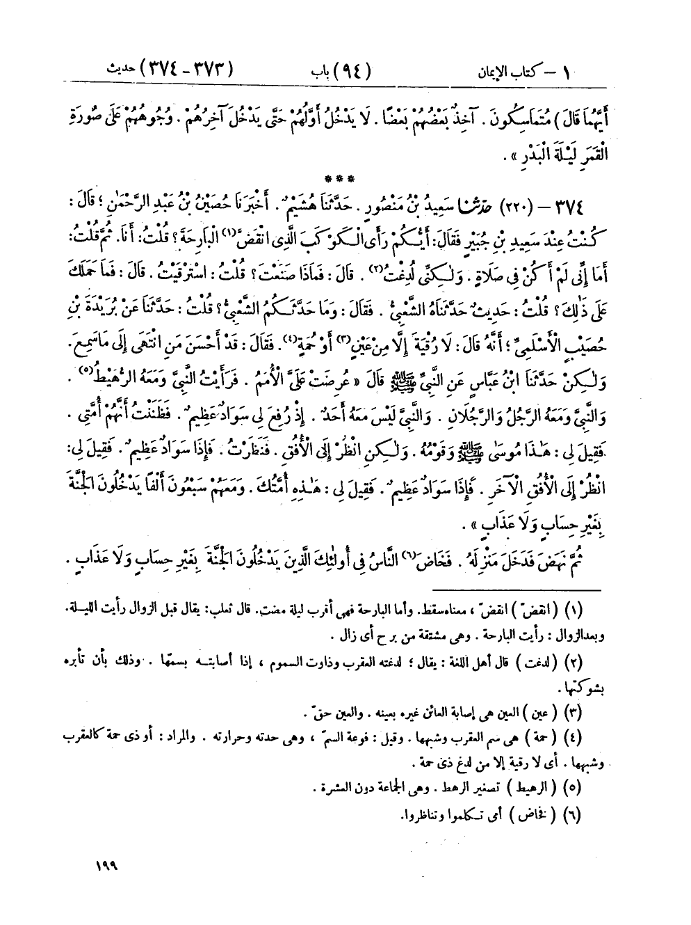 ٣٧٤ - (٢٢٠) حَدَّثَنَا سَعِيدُ بْنُ مَنْصُورٍ، حَدَّثَنَا هُشَيْمٌ، أَخْبَرَنَا حُصَيْنُ بْنُ عَبْدِ الرَّحْمَنِ، قَالَ: كُنْتُ عِنْدَ سَعِيدِ بْنِ جُبَيْرٍ، فَقَالَ: أَيُّكُمْ رَأَى الْكَوْكَبَ الَّذِي انْقَضَّ الْبَارِحَةَ؟ قُلْتُ: أَنَا، ثُمَّ قُلْتُ: أَمَا إِنِّي لَمْ أَكُنْ فِي صَلَاةٍ، وَلَكِنِّي لُدِغْتُ، قَالَ: فَمَاذَا صَنَعْتَ؟ قُلْتُ: اسْتَرْقَيْتُ، قَالَ: فَمَا حَمَلَكَ عَلَى ذَلِكَ؟ قُلْتُ: حَدِيثٌ حَدَّثَنَاهُ الشَّعْبِيُّ فَقَالَ: وَمَا حَدَّثَكُمُ الشَّعْبِيُّ؟ قُلْتُ: حَدَّثَنَا عَنْ بُرَيْدَةَ بْنِ حُصَيْبٍ الْأَسْلَمِيِّ، أَنَّهُ قَالَ: لَا رُقْيَةَ إِلَّا مِنْ عَيْنٍ، أَوْ حُمَةٍ، فَقَالَ: قَدْ أَحْسَنَ مَنِ انْتَهَى إِلَى مَا سَمِعَ، وَلَكِنْ حَدَّثَنَا ابْنُ عَبَّاسٍ، عَنِ النَّبِيِّ صَلَّى اللهُ عَلَيْهِ وَسَلَّمَ قَالَ: " عُرِضَتْ عَلَيَّ الْأُمَمُ، فَرَأَيْتُ النَّبِيَّ صَلَّى اللهُ عَلَيْهِ وَسَلَّمَ وَمَعَهُ الرُّهَيْطُ، وَالنَّبِيَّ وَمَعَهُ الرَّجُلُ وَالرَّجُلَانِ، وَالنَّبِيَّ لَيْسَ مَعَهُ أَحَدٌ، إِذْ رُفِعَ لِي سَوَادٌ عَظِيمٌ، فَظَنَنْتُ أَنَّهُمْ أُمَّتِي، فَقِيلَ لِي: هَذَا مُوسَى صَلَّى اللهُ عَلَيْهِ وَسَلَّمَ وَقَوْمُهُ، وَلَكِنْ انْظُرْ إِلَى الْأُفُقِ، فَنَظَرْتُ فَإِذَا سَوَادٌ عَظِيمٌ، فَقِيلَ لِي: انْظُرْ إِلَى الْأُفُقِ الْآخَرِ، فَإِذَا سَوَادٌ عَظِيمٌ، فَقِيلَ لِي: هَذِهِ أُمَّتُكَ وَمَعَهُمْ سَبْعُونَ أَلْفًا يَدْخُلُونَ الْجَنَّةَ بِغَيْرِ حِسَابٍ وَلَا عَذَابٍ "، ثُمَّ نَهَضَ فَدَخَلَ مَنْزِلَهُ فَخَاضَ النَّاسُ فِي أُولَئِكَ الَّذِينَ يَدْخُلُونَ الْجَنَّةَ بِغَيْرِ حِسَابٍ وَلَا عَذَابٍ، فَقَالَ بَعْضُهُمْ: فَلَعَلَّهُمُ الَّذِينَ صَحِبُوا رَسُولَ اللهِ صَلَّى اللهُ عَلَيْهِ وَسَلَّمَ، وَقَالَ بَعْضُهُمْ: فَلَعَلَّهُمُ الَّذِينَ وُلِدُوا فِي الْإِسْلَامِ وَلَمْ يُشْرِكُوا بِاللهِ، وَذَكَرُوا أَشْيَاءَ فَخَرَجَ عَلَيْهِمْ رَسُولُ اللهِ صَلَّى اللهُ عَلَيْهِ وَسَلَّمَ، فَقَالَ: «مَا الَّذِي تَخُوضُونَ فِيهِ؟» فَأَخْبَرُوهُ، فَقَالَ: «هُمُ الَّذِينَ لَا يَرْقُونَ، وَلَا يَسْتَرْقُونَ، وَلَا يَتَطَيَّرُونَ، وَعَلَى رَبِّهِمْ يَتَوَكَّلُونَ»، فَقَامَ عُكَّاشَةُ بْنُ مِحْصَنٍ، فَقَالَ: " ادْعُ اللهَ أَنْ يَجْعَلَنِي مِنْهُمْ، فَقَالَ: «أَنْتَ مِنْهُمْ؟» ثُمَّ قَامَ رَجُلٌ آخَرُ، فَقَالَ: ادْعُ اللهَ أَنْ يَجْعَلَنِي مِنْهُمْ، فَقَالَ: «سَبَقَكَ بِهَا عُكَّاشَةُ»،