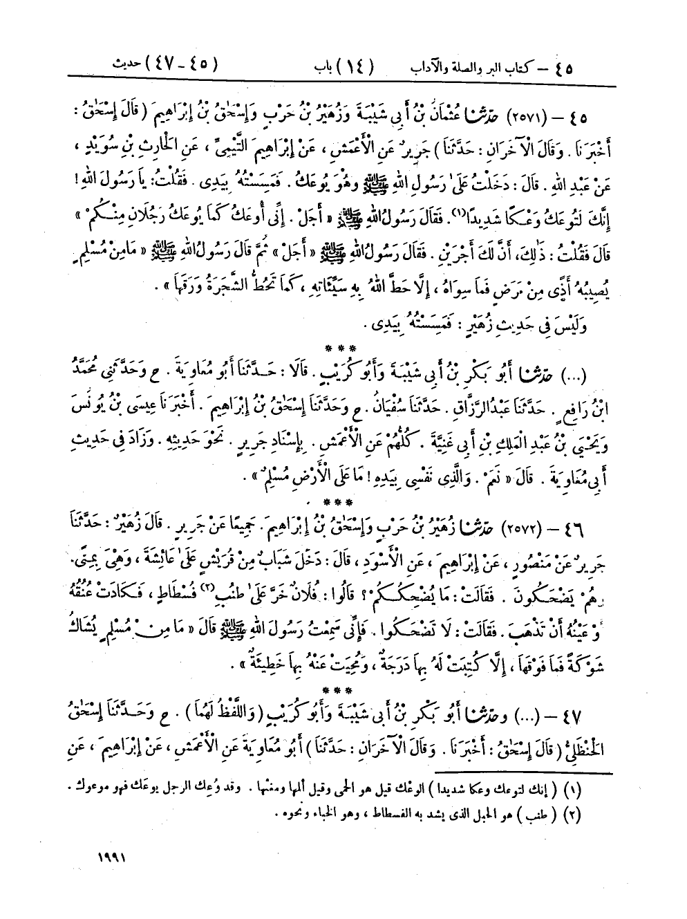 ٤٥ - (٢٥٧١) حَدَّثَنَا عُثْمَانُ بْنُ أَبِي شَيْبَةَ، وَزُهَيْرُ بْنُ حَرْبٍ، وَإِسْحَاقُ بْنُ إِبْرَاهِيمَ، - قَالَ إِسْحَاقُ أَخْبَرَنَا وقَالَ الْآخَرَانِ حَدَّثَنَا - جَرِيرٌ، عَنِ الْأَعْمَشِ، عَنْ إِبْرَاهِيمَ التَّيْمِيِّ، عَنِ الْحَارِثِ بْنِ سُوَيْدٍ، عَنْ عَبْدِ اللهِ، قَالَ: دَخَلْتُ عَلَى رَسُولِ اللهِ صَلَّى اللهُ عَلَيْهِ وَسَلَّمَ وَهُوَ يُوعَكُ، فَمَسِسْتُهُ بِيَدِي، فَقُلْتُ: يَا رَسُولَ اللهِ إِنَّكَ لَتُوعَكُ وَعْكًا شَدِيدًا، فَقَالَ رَسُولُ اللهِ صَلَّى اللهُ عَلَيْهِ وَسَلَّمَ: «أَجَلْ إِنِّي أُوعَكُ كَمَا يُوعَكُ رَجُلَانِ مِنْكُمْ» قَالَ: فَقُلْتُ: ذَلِكَ أَنَّ لَكَ أَجْرَيْنِ، فَقَالَ رَسُولُ اللهِ صَلَّى اللهُ عَلَيْهِ وَسَلَّمَ: «أَجَلْ» ثُمَّ قَالَ رَسُولُ اللهِ صَلَّى اللهُ عَلَيْهِ وَسَلَّمَ: «مَا مِنْ مُسْلِمٍ يُصِيبُهُ أَذًى مِنْ مَرَضٍ، فَمَا سِوَاهُ إِلَّا حَطَّ اللهُ بِهِ سَيِّئَاتِهِ، كَمَا تَحُطُّ الشَّجَرَةُ وَرَقَهَا» وَلَيْسَ فِي حَدِيثِ زُهَيْرٍ: فَمَسِسْتُهُ بِيَدِي.