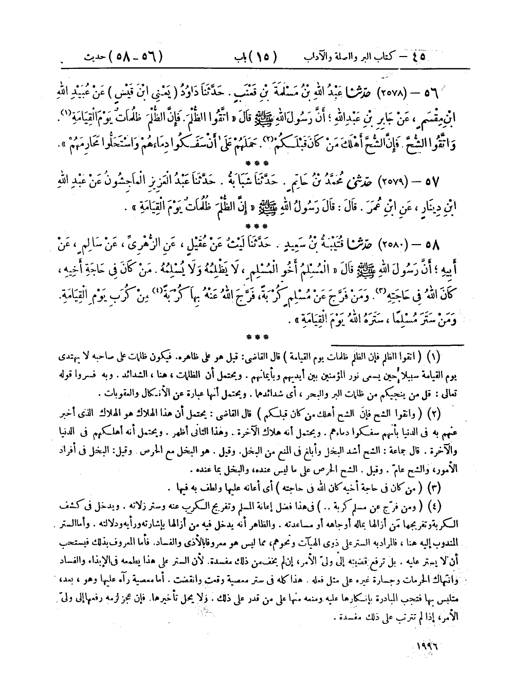 ٥٦ - (٢٥٧٨) حَدَّثَنَا عَبْدُ اللهِ بْنُ مَسْلَمَةَ بْنِ قَعْنَبٍ، حَدَّثَنَا دَاوُدُ يَعْنِي ابْنَ قَيْسٍ، عَنْ عُبَيْدِ اللهِ بْنِ مِقْسَمٍ، عَنْ جَابِرِ بْنِ عَبْدِ اللهِ، أَنَّ رَسُولَ اللهِ صَلَّى اللهُ عَلَيْهِ وَسَلَّمَ، قَالَ: «اتَّقُوا الظُّلْمَ، فَإِنَّ الظُّلْمَ ظُلُمَاتٌ يَوْمَ الْقِيَامَةِ، وَاتَّقُوا الشُّحَّ، فَإِنَّ الشُّحَّ أَهْلَكَ مَنْ كَانَ قَبْلَكُمْ، حَمَلَهُمْ عَلَى أَنْ سَفَكُوا دِمَاءَهُمْ وَاسْتَحَلُّوا مَحَارِمَهُمْ»