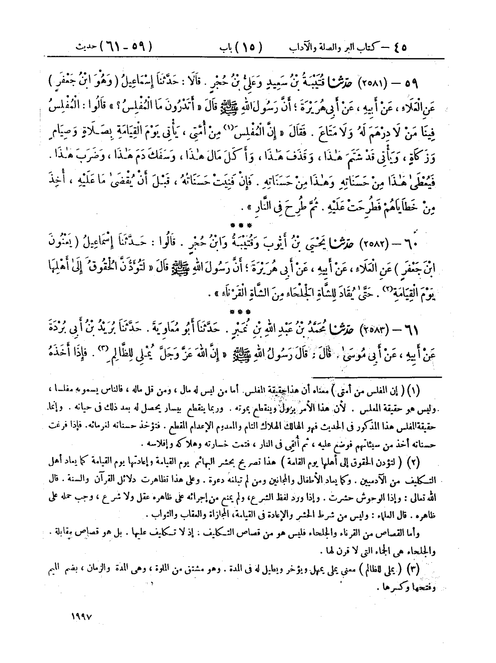 ٥٩ - (٢٥٨١) حَدَّثَنَا قُتَيْبَةُ بْنُ سَعِيدٍ، وَعَلِيُّ بْنُ حُجْرٍ، قَالَا: حَدَّثَنَا إِسْمَاعِيلُ وَهُوَ ابْنُ جَعْفَرٍ، عَنِ الْعَلَاءِ، عَنْ أَبِيهِ، عَنْ أَبِي هُرَيْرَةَ، أَنَّ رَسُولَ اللهِ صَلَّى اللهُ عَلَيْهِ وَسَلَّمَ، قَالَ: «أَتَدْرُونَ مَا الْمُفْلِسُ؟» قَالُوا: الْمُفْلِسُ فِينَا مَنْ لَا دِرْهَمَ لَهُ وَلَا مَتَاعَ، فَقَالَ: «إِنَّ الْمُفْلِسَ مِنْ أُمَّتِي يَأْتِي يَوْمَ الْقِيَامَةِ بِصَلَاةٍ، وَصِيَامٍ، وَزَكَاةٍ، وَيَأْتِي قَدْ شَتَمَ هَذَا، وَقَذَفَ هَذَا، وَأَكَلَ مَالَ هَذَا، وَسَفَكَ دَمَ هَذَا، وَضَرَبَ هَذَا، فَيُعْطَى هَذَا مِنْ حَسَنَاتِهِ، وَهَذَا مِنْ حَسَنَاتِهِ، فَإِنْ فَنِيَتْ حَسَنَاتُهُ قَبْلَ أَنْ يُقْضَى مَا عَلَيْهِ أُخِذَ مِنْ خَطَايَاهُمْ فَطُرِحَتْ عَلَيْهِ، ثُمَّ طُرِحَ فِي النَّارِ»