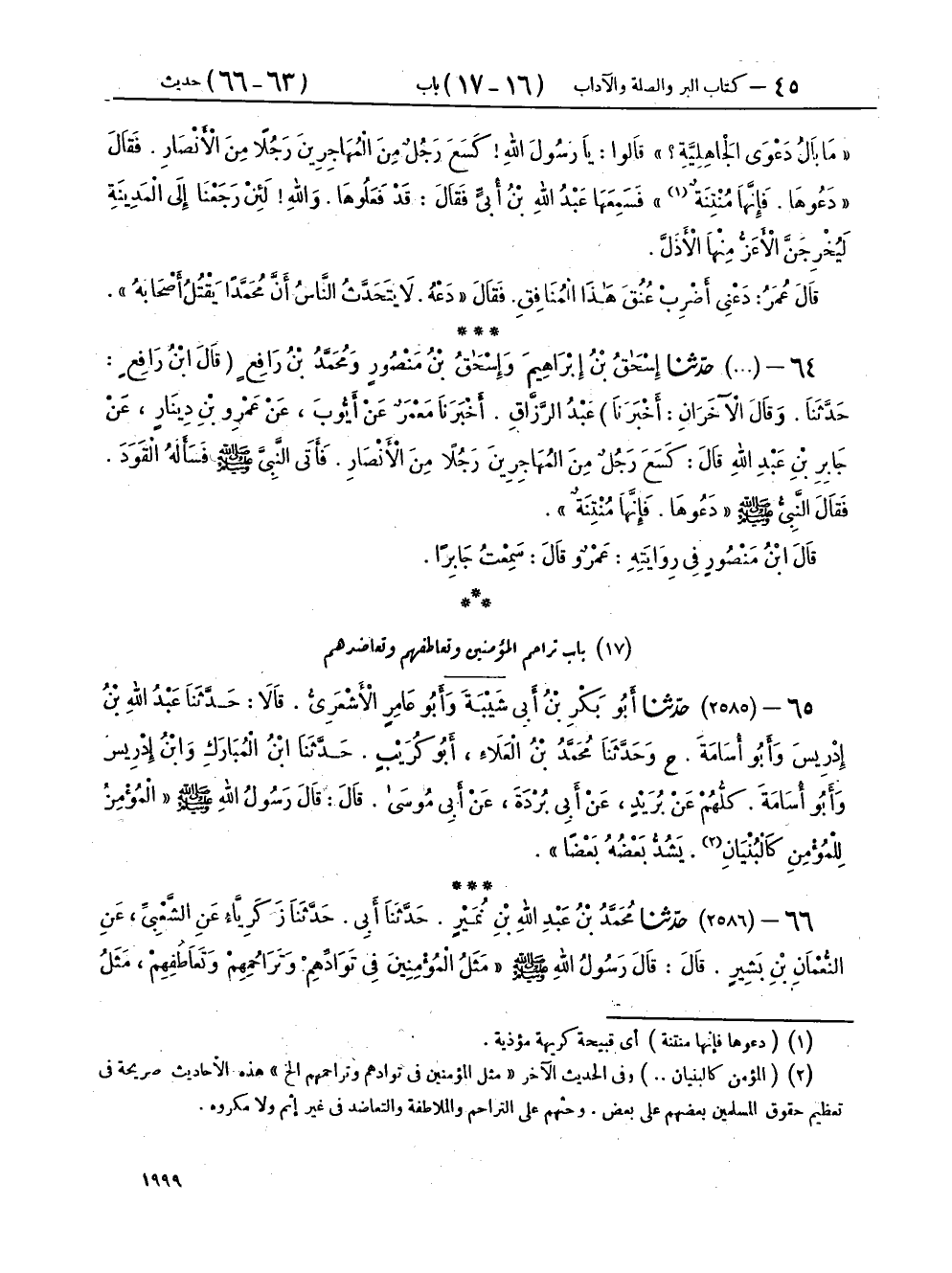 ٦٤ - (٢٥٨٤) حَدَّثَنَا إِسْحَاقُ بْنُ إِبْرَاهِيمَ، وَإِسْحَاقُ بْنُ مَنْصُورٍ، وَمُحَمَّدُ بْنُ رَافِعٍ - قَالَ ابْنُ رَافِعٍ: حَدَّثَنَا وقَالَ الْآخَرَانِ: أَخْبَرَنَا - عَبْدُ الرَّزَّاقِ، أَخْبَرَنَا مَعْمَرٌ، عَنْ أَيُّوبَ، عَنْ عَمْرِو بْنِ دِينَارٍ، عَنْ جَابِرِ بْنِ عَبْدِ اللهِ، قَالَ: كَسَعَ رَجُلٌ مِنَ الْمُهَاجِرِينَ رَجُلًا مِنَ الْأَنْصَارِ، فَأَتَى النَّبِيَّ صَلَّى اللهُ عَلَيْهِ وَسَلَّمَ فَسَأَلَهُ الْقَوَدَ فَقَالَ النَّبِيُّ صَلَّى اللهُ عَلَيْهِ وَسَلَّمَ: «دَعُوهَا، فَإِنَّهَا مُنْتِنَةٌ» قَالَ ابْنُ مَنْصُورٍ: فِي رِوَايَتِهِ عَمْرٌو، قَالَ: سَمِعْتُ جَابِرًا