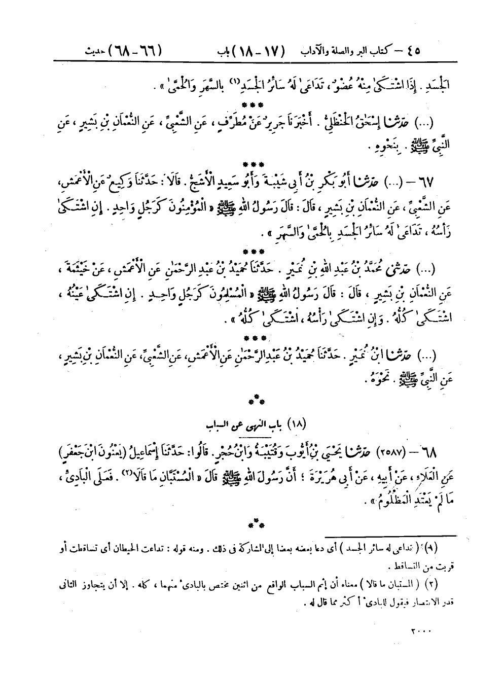 ٦٧ - (٢٥٨٦) حَدَّثَنَا أَبُو بَكْرِ بْنُ أَبِي شَيْبَةَ، وَأَبُو سَعِيدٍ الْأَشَجُّ، قَالَا: حَدَّثَنَا وَكِيعٌ، عَنِ الْأَعْمَشِ، عَنِ الشَّعْبِيِّ، عَنِ النُّعْمَانِ بْنِ بَشِيرٍ، قَالَ: قَالَ رَسُولُ اللهِ صَلَّى اللهُ عَلَيْهِ وَسَلَّمَ: «الْمُؤْمِنُونَ كَرَجُلٍ وَاحِدٍ إِنِ اشْتَكَى رَأْسُهُ تَدَاعَى لَهُ سَائِرُ الْجَسَدِ بِالْحُمَّى وَالسَّهَرِ»