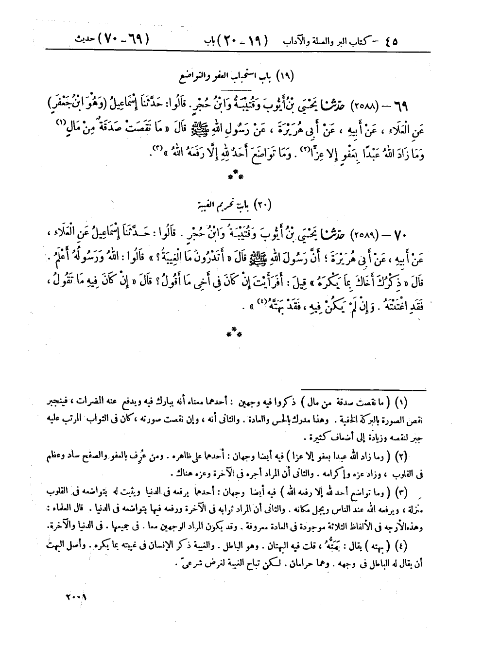[ ش (ما نقصت صدقة من مال) ذكروا فيه وجهين أحدهما معناه أنه يبارك فيه ويدفع عنه المضرات فينجبر نقص الصورة بالبركة الخفية وهذا مدرك بالحس والعادة والثاني أنه وإن نقصت صورته كان في الثواب المرتب عليه جبر لنقصه وزيادة إلى أضعاف كثيرة (وما زاد الله عبدا بعفو إلا عزا) فيه أيضا وجهان أحدهما على ظاهره ومن عرف بالعفو والصفح ساد وعظم في القلوب وزاد عزه وإكرامه والثاني أن المراد أجره في الآخرة وعزه هناك (وما تواضع أحد لله إلا رفعه الله) فيه أيضا وجهان أحدهما يرفعه في الدنيا ويثبت له بتواضعه في القلوب منزلة ويرفعه الله عند الناس ويجل مكانه والثاني أن المراد ثوابه في الآخرة ورفعه فيها بتواضعه في الدنيا قال العلماء وهذه الأوجه في الألفاظ الثلاثة موجودة في العادة معروفة وقد يكون المراد الوجهين معا في جميعها في الدنيا والآخرة]