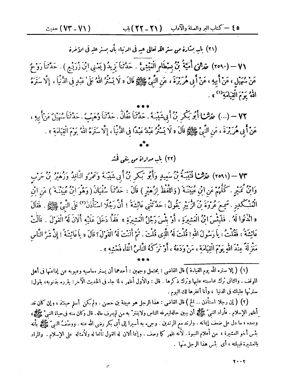 ٧٣ - (٢٥٩١) حَدَّثَنَا قُتَيْبَةُ بْنُ سَعِيدٍ، وَأَبُو بَكْرِ بْنُ أَبِي شَيْبَةَ، وَعَمْرٌو النَّاقِدُ، وَزُهَيْرُ بْنُ حَرْبٍ، وَابْنُ نُمَيْرٍ كُلُّهُمْ عَنِ ابْنِ عُيَيْنَةَ - وَاللَّفْظُ لِزُهَيْرٍ - قَالَ: حَدَّثَنَا سُفْيَانُ وَهُوَ ابْنُ عُيَيْنَةَ، عَنِ ابْنِ الْمُنْكَدِرِ، سَمِعَ عُرْوَةَ بْنَ الزُّبَيْرِ، يَقُولُ: حَدَّثَتْنِي عَائِشَةُ، أَنَّ رَجُلًا اسْتَأْذَنَ عَلَى النَّبِيِّ صَلَّى اللهُ عَلَيْهِ وَسَلَّمَ، فَقَالَ: «ائْذَنُوا لَهُ، فَلَبِئْسَ ابْنُ الْعَشِيرَةِ، أَوْ بِئْسَ رَجُلُ الْعَشِيرَةِ» فَلَمَّا دَخَلَ عَلَيْهِ أَلَانَ لَهُ الْقَوْلَ، قَالَتْ عَائِشَةُ: فَقُلْتُ: يَا رَسُولَ اللهِ قُلْتَ لَهُ الَّذِي قُلْتَ، ثُمَّ أَلَنْتَ لَهُ الْقَوْلَ؟ قَالَ: «يَا عَائِشَةُ إِنَّ شَرَّ النَّاسِ مَنْزِلَةً عِنْدَ اللهِ يَوْمَ الْقِيَامَةِ، مَنْ وَدَعَهُ، أَوْ تَرَكَهُ النَّاسُ اتِّقَاءَ فُحْشِهِ»