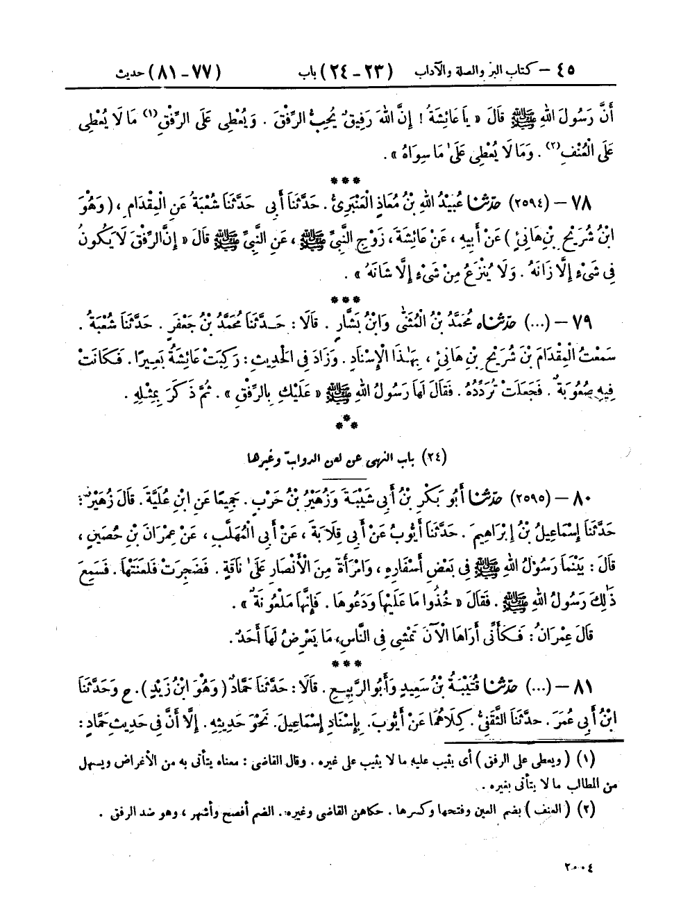 ٧٩ - (٢٥٩٤) حَدَّثَنَاهُ مُحَمَّدُ بْنُ الْمُثَنَّى، وَابْنُ بَشَّارٍ، قَالَا: حَدَّثَنَا مُحَمَّدُ بْنُ جَعْفَرٍ، حَدَّثَنَا شُعْبَةُ، سَمِعْتُ الْمِقْدَامَ بْنَ شُرَيْحِ بْنِ هَانِئٍ، بِهَذَا الْإِسْنَادِ، وَزَادَ فِي الْحَدِيثِ: رَكِبَتْ عَائِشَةُ بَعِيرًا، فَكَانَتْ فِيهِ صُعُوبَةٌ، فَجَعَلَتْ تُرَدِّدُهُ، فَقَالَ لَهَا رَسُولُ اللهِ صَلَّى اللهُ عَلَيْهِ وَسَلَّمَ «عَلَيْكِ بِالرِّفْقِ» ثُمَّ ذَكَرَ بِمِثْلِهِ