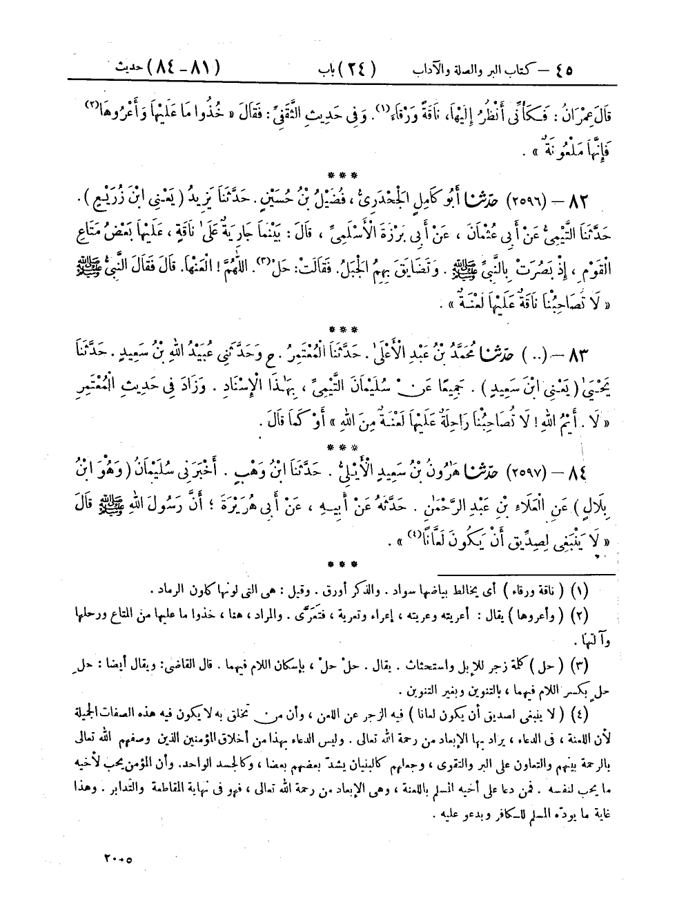 ٨٢ - (٢٥٩٦) حَدَّثَنَا أَبُو كَامِلٍ الْجَحْدَرِيُّ فُضَيْلُ بْنُ حُسَيْنٍ، حَدَّثَنَا يَزِيدُ يَعْنِي ابْنَ زُرَيْعٍ، حَدَّثَنَا التَّيْمِيُّ، عَنْ أَبِي عُثْمَانَ، عَنْ أَبِي بَرْزَةَ الْأَسْلَمِيِّ، قَالَ: بَيْنَمَا جَارِيَةٌ عَلَى نَاقَةٍ، عَلَيْهَا بَعْضُ مَتَاعِ الْقَوْمِ، إِذْ بَصُرَتْ بِالنَّبِيِّ صَلَّى اللهُ عَلَيْهِ وَسَلَّمَ، وَتَضَايَقَ بِهِمِ الْجَبَلُ، فَقَالَتْ: حَلْ، اللهُمَّ الْعَنْهَا، قَالَ: فَقَالَ النَّبِيُّ صَلَّى اللهُ عَلَيْهِ وَسَلَّمَ: «لَا تُصَاحِبْنَا نَاقَةٌ عَلَيْهَا لَعْنَةٌ»