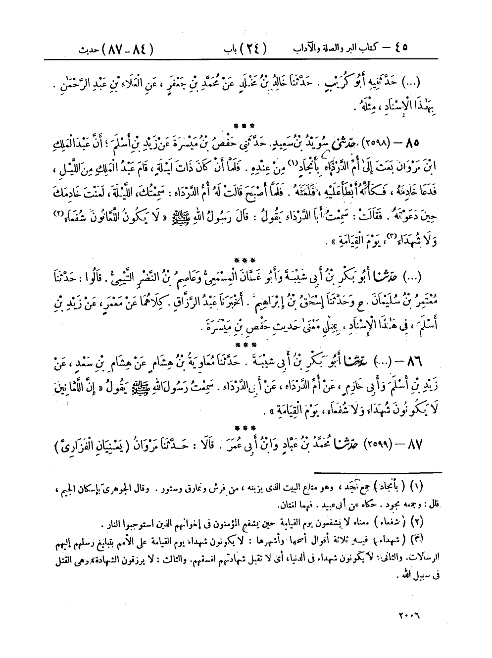 ٨٥ - (٢٥٩٨) حَدَّثَنِي سُوَيْدُ بْنُ سَعِيدٍ، حَدَّثَنِي حَفْصُ بْنُ مَيْسَرَةَ، عَنْ زَيْدِ بْنِ أَسْلَمَ، أَنَّ عَبْدَ الْمَلِكِ بْنَ مَرْوَانَ، بَعَثَ إِلَى أُمِّ الدَّرْدَاءِ بِأَنْجَادٍ مِنْ عِنْدِهِ، فَلَمَّا أَنْ كَانَ ذَاتَ لَيْلَةٍ، قَامَ عَبْدُ الْمَلِكِ مِنَ اللَّيْلِ، فَدَعَا خَادِمَهُ، فَكَأَنَّهُ أَبْطَأَ عَلَيْهِ، فَلَعَنَهُ، فَلَمَّا أَصْبَحَ قَالَتْ لَهُ أُمُّ الدَّرْدَاءِ: سَمِعْتُكَ اللَّيْلَةَ، لَعَنْتَ خَادِمَكَ حِينَ دَعَوْتَهُ، فَقَالَتْ: سَمِعْتُ أَبَا الدَّرْدَاءِ يَقُولُ: قَالَ رَسُولُ اللهِ صَلَّى اللهُ عَلَيْهِ وَسَلَّمَ: «لَا يَكُونُ اللَّعَّانُونَ شُفَعَاءَ وَلَا شُهَدَاءَ، يَوْمَ الْقِيَامَةِ»