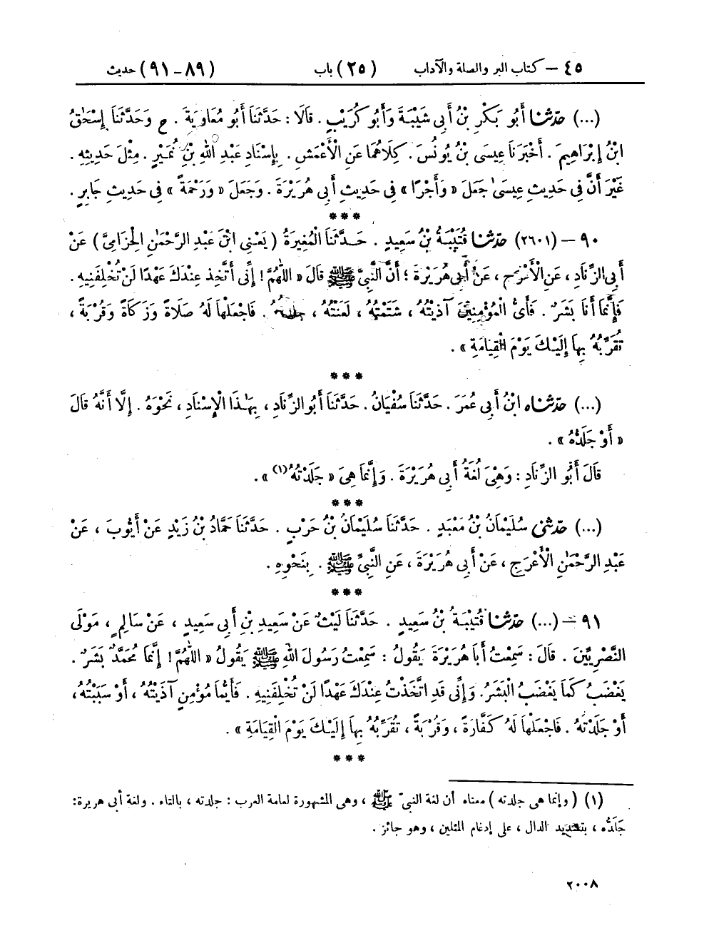 ٩١ - (٢٦٠١) حَدَّثَنَا قُتَيْبَةُ بْنُ سَعِيدٍ، حَدَّثَنَا لَيْثٌ، عَنْ سَعِيدِ بْنِ أَبِي سَعِيدٍ، عَنْ سَالِمٍ، مَوْلَى النَّصْرِيِّينَ، قَالَ: سَمِعْتُ أَبَا هُرَيْرَةَ، يَقُولُ: سَمِعْتُ رَسُولَ اللهِ صَلَّى اللهُ عَلَيْهِ وَسَلَّمَ، يَقُولُ: «اللهُمَّ إِنَّمَا مُحَمَّدٌ بَشَرٌ، يَغْضَبُ كَمَا يَغْضَبُ الْبَشَرُ، وَإِنِّي قَدِ اتَّخَذْتُ عِنْدَكَ عَهْدًا لَنْ تُخْلِفَنِيهِ، فَأَيُّمَا مُؤْمِنٍ آذَيْتُهُ، أَوْ سَبَبْتُهُ، أَوْ جَلَدْتُهُ، فَاجْعَلْهَا لَهُ كَفَّارَةً، وَقُرْبَةً، تُقَرِّبُهُ بِهَا إِلَيْكَ يَوْمَ الْقِيَامَةِ»