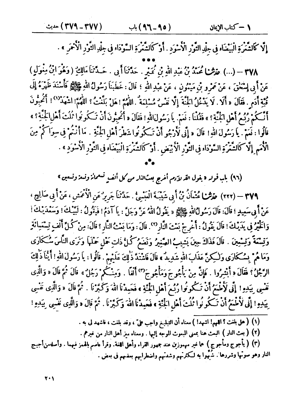 ٣٧٩ - (٢٢٢) حَدَّثَنَا عُثْمَانُ بْنُ أَبِي شَيْبَةَ الْعَبْسِيُّ، حَدَّثَنَا جَرِيرٌ، عَنِ الْأَعْمَشِ، عَنْ أَبِي صَالِحٍ، عَنْ أَبِي سَعِيدٍ، قَالَ: قَالَ رَسُولُ اللهِ صَلَّى اللهُ عَلَيْهِ وَسَلَّمَ: " يَقُولُ اللهُ عَزَّ وَجَلَّ: يَا آدَمُ فَيَقُولُ: لَبَّيْكَ وَسَعْدَيْكَ وَالْخَيْرُ فِي يَدَيْكَ، قَالَ يَقُولُ: أَخْرِجْ بَعْثَ النَّارِ قَالَ: وَمَا بَعْثُ النَّارِ قَالَ: مِنْ كُلِّ أَلْفٍ تِسْعَمِائَةٍ وَتِسْعَةً وَتِسْعِينَ قَالَ: فَذَاكَ حِينَ يَشِيبُ الصَّغِيرُ وَتَضَعُ كُلُّ ذَاتِ حَمْلٍ حَمْلَهَا وَتَرَى النَّاسَ سُكَارَى وَمَا هُمْ بِسُكَارَى وَلَكِنَّ عَذَابَ اللهِ شَدِيدٌ " قَالَ: فَاشْتَدَّ ذَلِكَ عَلَيْهِمْ قَالُوا: يَا رَسُولَ اللهِ أَيُّنَا ذَلِكَ الرَّجُلُ؟ فَقَالَ: «أَبْشِرُوا فَإِنَّ مِنْ يَأْجُوجَ وَمَأْجُوجَ أَلْفًا، وَمِنْكُمْ رَجُلٌ» قَالَ: ثُمَّ قَالَ: «وَالَّذِي نَفْسِي بِيَدِهِ، إِنِّي لَأَطْمَعُ أَنْ تَكُونُوا رُبُعَ أَهْلِ الْجَنَّةِ» فَحَمِدْنَا اللهَ وَكَبَّرْنَا. ثُمَّ قَالَ: «وَالَّذِي نَفْسِي بِيَدِهِ، إِنِّي لَأَطْمَعُ أَنْ تَكُونُوا ثُلُثَ أَهْلِ الْجَنَّةِ» فَحَمِدْنَا اللهَ وَكَبَّرْنَا. ثُمَّ قَالَ: «وَالَّذِي نَفْسِي بِيَدِهِ، إِنِّي لَأَطْمَعُ أَنْ تَكُونُوا شَطْرَ أَهْلِ الْجَنَّةِ، إِنَّ مَثَلَكُمْ فِي الْأُمَمِ كَمَثَلِ الشَّعْرَةِ الْبَيْضَاءِ فِي جِلْدِ الثَّوْرِ الْأَسْوَدِ، أَوْ كَالرَّقْمَةِ فِي ذِرَاعِ الْحِمَارِ»