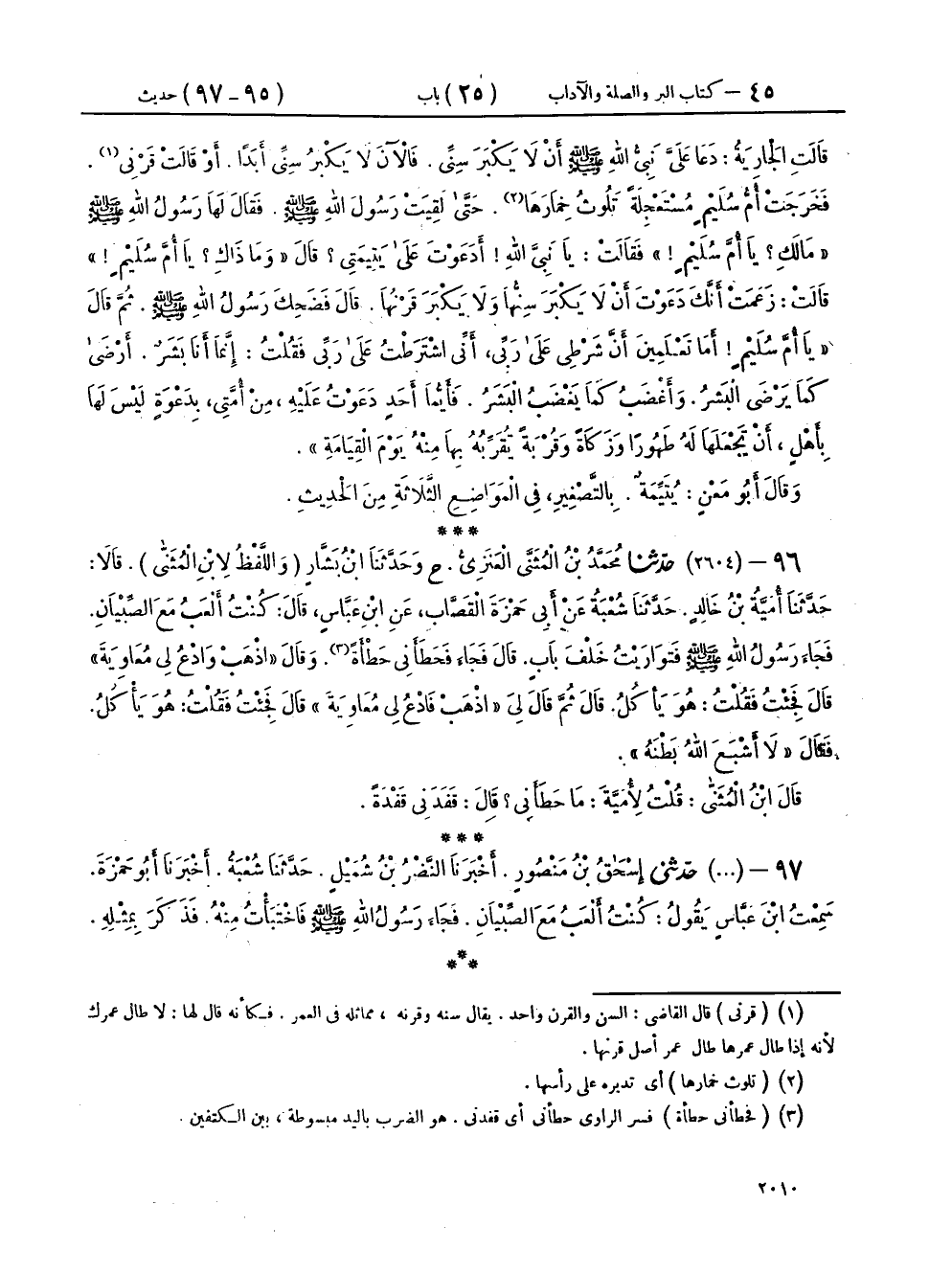 ٩٦ - (٢٦٠٤) حَدَّثَنَا مُحَمَّدُ بْنُ الْمُثَنَّى الْعَنَزِيُّ، ح وَحَدَّثَنَا ابْنُ بَشَّارٍ، - وَاللَّفْظُ لِابْنِ الْمُثَنَّى - قَالَا: حَدَّثَنَا أُمَيَّةُ بْنُ خَالِدٍ، حَدَّثَنَا شُعْبَةُ، عَنْ أَبِي حَمْزَةَ الْقَصَّابِ، عَنِ ابْنِ عَبَّاسٍ، قَالَ: كُنْتُ أَلْعَبُ مَعَ الصِّبْيَانِ، فَجَاءَ رَسُولُ اللهِ صَلَّى اللهُ عَلَيْهِ وَسَلَّمَ فَتَوَارَيْتُ خَلْفَ بَابٍ، قَالَ فَجَاءَ فَحَطَأَنِي حَطْأَةً، وَقَالَ: «اذْهَبْ وَادْعُ لِي مُعَاوِيَةَ» قَالَ: فَجِئْتُ فَقُلْتُ: هُوَ يَأْكُلُ، قَالَ: ثُمَّ قَالَ لِيَ: «اذْهَبْ فَادْعُ لِي مُعَاوِيَةَ» قَالَ: فَجِئْتُ فَقُلْتُ: هُوَ يَأْكُلُ، فَقَالَ: «لَا أَشْبَعَ اللهُ بَطْنَهُ» قَالَ ابْنُ الْمُثَنَّى: قُلْتُ لِأُمَيَّةَ: مَا حَطَأَنِي؟ قَالَ: قَفَدَنِي قَفْدَةً