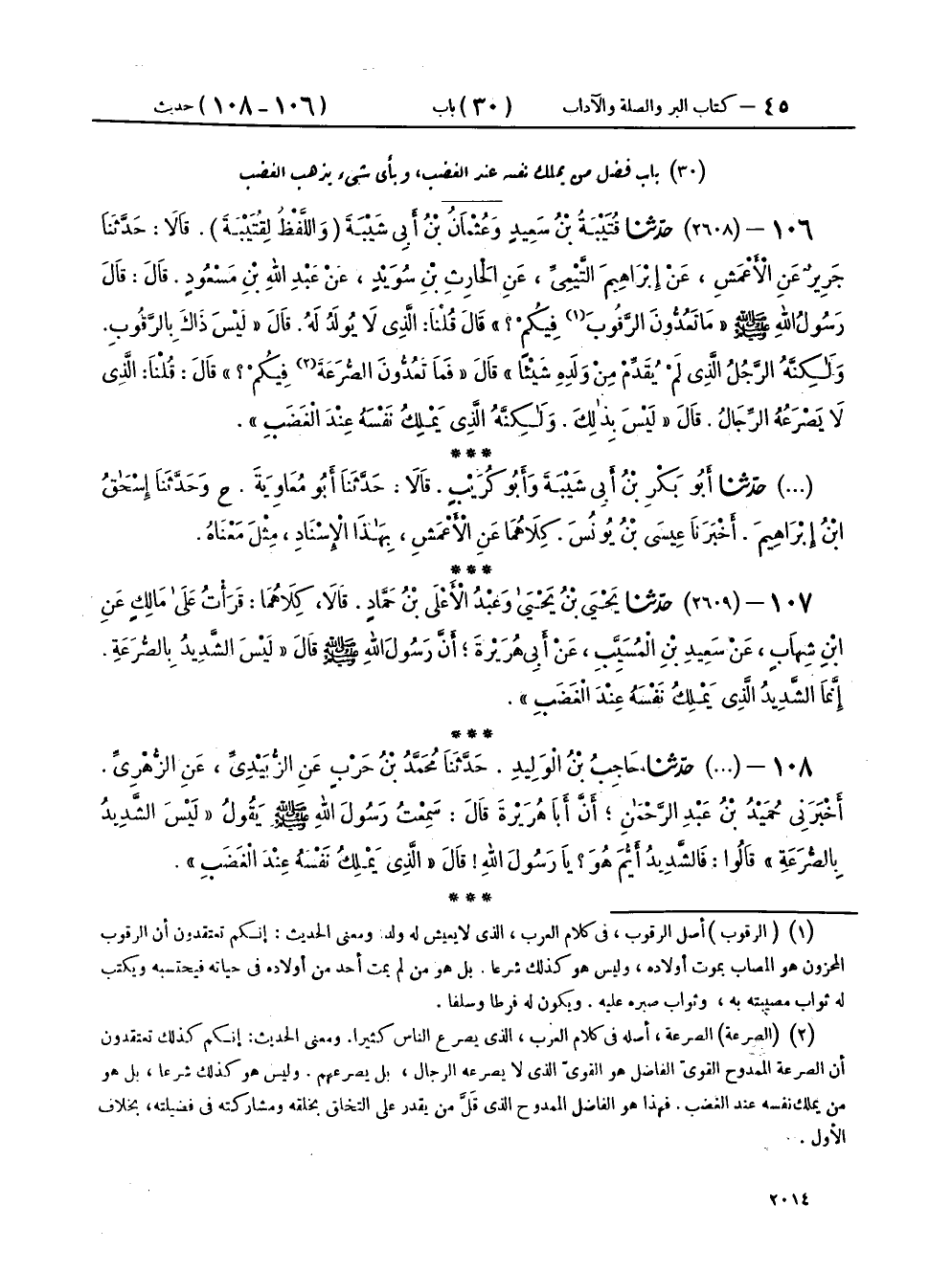 ١٠٧ - (٢٦٠٩) حَدَّثَنَا يَحْيَى بْنُ يَحْيَى، وَعَبْدُ الْأَعْلَى بْنُ حَمَّادٍ، قَالَا: كِلَاهُمَا قَرَأْتُ عَلَى مَالِكٍ، عَنِ ابْنِ شِهَابٍ، عَنْ سَعِيدِ بْنِ الْمُسَيِّبِ، عَنْ أَبِي هُرَيْرَةَ، أَنَّ رَسُولَ اللهِ صَلَّى اللهُ عَلَيْهِ وَسَلَّمَ، قَالَ: «لَيْسَ الشَّدِيدُ بِالصُّرَعَةِ إِنَّمَا الشَّدِيدُ الَّذِي يَمْلِكُ نَفْسَهُ عِنْدَ الْغَضَبِ»
