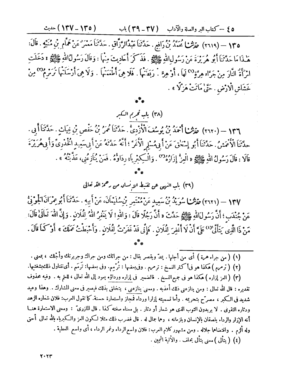 ١٣٥ - (٢٦١٩) حَدَّثَنَا مُحَمَّدُ بْنُ رَافِعٍ، حَدَّثَنَا عَبْدُ الرَّزَّاقِ، حَدَّثَنَا مَعْمَرٌ، عَنْ هَمَّامِ بْنِ مُنَبِّهٍ، قَالَ: هَذَا مَا حَدَّثَنَا أَبُو هُرَيْرَةَ، عَنْ رَسُولِ اللهِ صَلَّى اللهُ عَلَيْهِ وَسَلَّمَ، فَذَكَرَ أَحَادِيثَ مِنْهَا، وَقَالَ رَسُولُ اللهِ صَلَّى اللهُ عَلَيْهِ وَسَلَّمَ: «دَخَلَتِ امْرَأَةٌ النَّارَ مِنْ جَرَّاءِ هِرَّةٍ لَهَا، أَوْ هِرٍّ، رَبَطَتْهَا فَلَا هِيَ أَطْعَمَتْهَا، وَلَا هِيَ أَرْسَلَتْهَا تُرَمْرِمُ مِنْ خَشَاشِ الْأَرْضِ حَتَّى مَاتَتْ هَزْلًا»