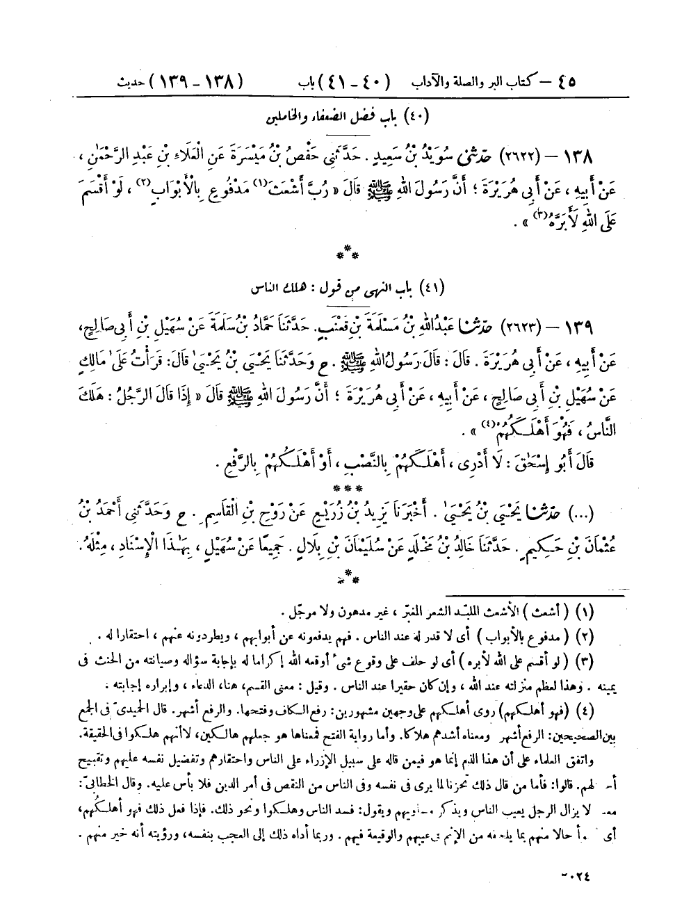 ١٣٩ - (٢٦٢٣) حَدَّثَنَا عَبْدُ اللهِ بْنُ مَسْلَمَةَ بْنِ قَعْنَبٍ، حَدَّثَنَا حَمَّادُ بْنُ سَلَمَةَ، عَنْ سُهَيْلِ بْنِ أَبِي صَالِحٍ، عَنْ أَبِيهِ، عَنْ أَبِي هُرَيْرَةَ، قَالَ: قَالَ رَسُولُ اللهِ صَلَّى اللهُ عَلَيْهِ وَسَلَّمَ: ح وَحَدَّثَنَا يَحْيَى بْنُ يَحْيَى، قَالَ: قَرَأْتُ عَلَى مَالِكٍ، عَنْ سُهَيْلِ بْنِ أَبِي صَالِحٍ، عَنْ أَبِيهِ، عَنْ أَبِي هُرَيْرَةَ أَنَّ رَسُولَ اللهِ صَلَّى اللهُ عَلَيْهِ وَسَلَّمَ، قَالَ: " إِذَا قَالَ الرَّجُلُ: هَلَكَ النَّاسُ فَهُوَ أَهْلَكُهُمْ " قَالَ أَبُو إِسْحَاقَ: لَا أَدْرِي، أَهْلَكَهُمْ بِالنَّصْبِ، أَوْ أَهْلَكُهُمْ بِالرَّفْعِ.