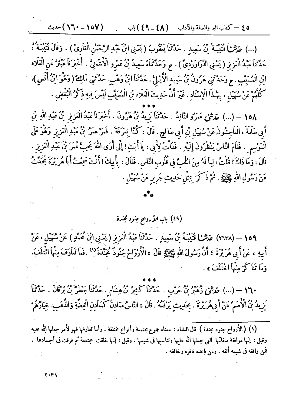 ١٥٩ - (٢٦٣٨) حَدَّثَنَا قُتَيْبَةُ بْنُ سَعِيدٍ، حَدَّثَنَا عَبْدُ الْعَزِيزِ يَعْنِي ابْنَ مُحَمَّدٍ، عَنْ سُهَيْلٍ، عَنْ أَبِيهِ، عَنْ أَبِي هُرَيْرَةَ، أَنَّ رَسُولَ اللهِ صَلَّى اللهُ عَلَيْهِ وَسَلَّمَ، قَالَ: «الْأَرْوَاحُ جُنُودٌ مُجَنَّدَةٌ، فَمَا تَعَارَفَ مِنْهَا ائْتَلَفَ، وَمَا تَنَاكَرَ مِنْهَا اخْتَلَفَ»