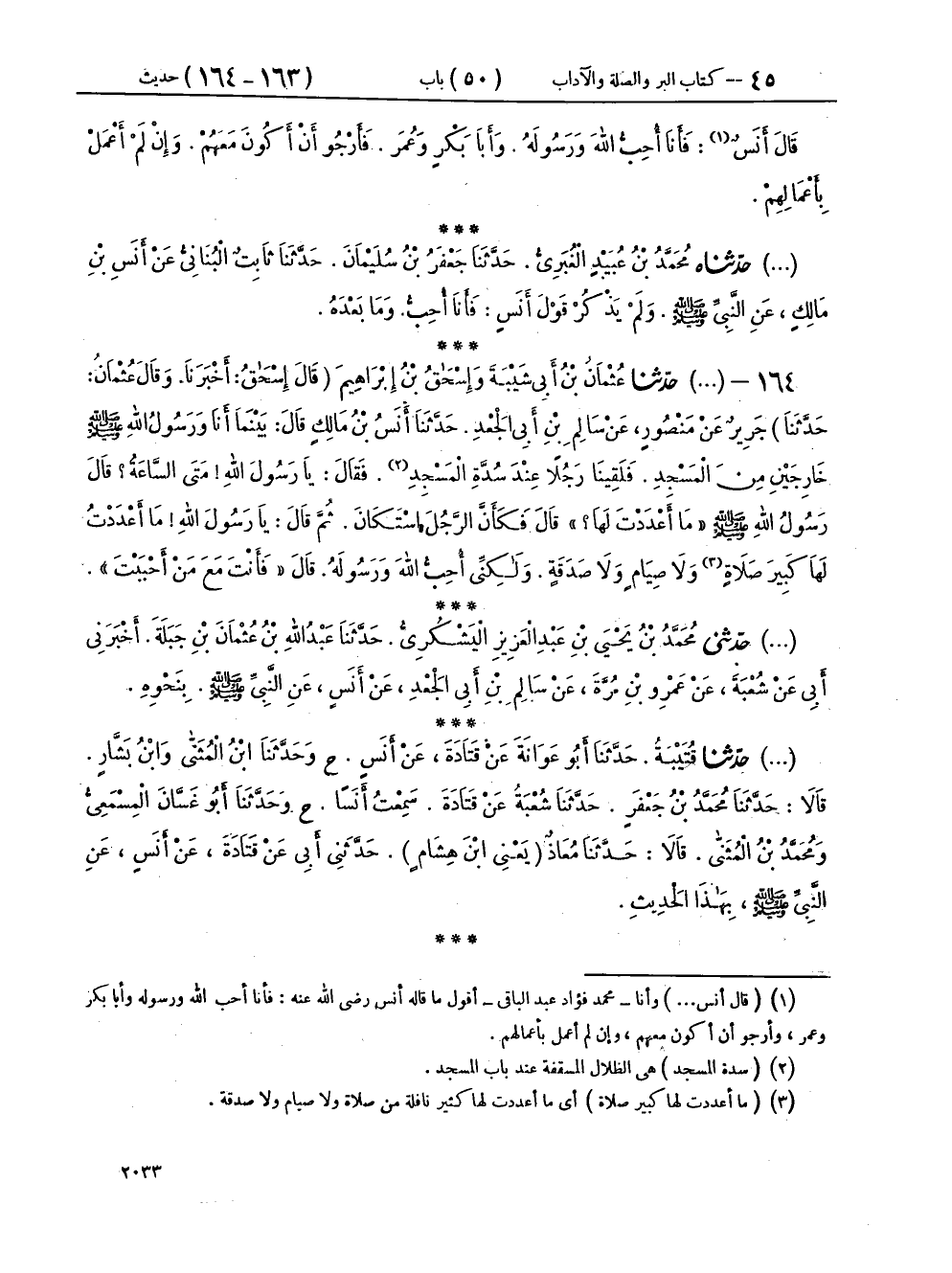 ١٦٤ - (٢٦٣٩) حَدَّثَنَا عُثْمَانُ بْنُ أَبِي شَيْبَةَ، وَإِسْحَاقُ بْنُ إِبْرَاهِيمَ - قَالَ إِسْحَاقُ: أَخْبَرَنَا، وقَالَ عُثْمَانُ: حَدَّثَنَا - جَرِيرٌ، عَنْ مَنْصُورٍ، عَنْ سَالِمِ بْنِ أَبِي الْجَعْدِ، حَدَّثَنَا أَنَسُ بْنُ مَالِكٍ، قَالَ: بَيْنَمَا أَنَا وَرَسُولُ اللهِ صَلَّى اللهُ عَلَيْهِ وَسَلَّمَ خَارِجَيْنِ مِنَ الْمَسْجِدِ، فَلَقِينَا رَجُلًا عِنْدَ سُدَّةِ الْمَسْجِدِ، فَقَالَ: يَا رَسُولَ اللهِ مَتَى السَّاعَةُ؟ قَالَ رَسُولُ اللهِ صَلَّى اللهُ عَلَيْهِ وَسَلَّمَ: «مَا أَعْدَدْتَ لَهَا؟» قَالَ فَكَأَنَّ الرَّجُلَ اسْتَكَانَ، ثُمَّ قَالَ: يَا رَسُولَ اللهِ مَا أَعْدَدْتُ لَهَا كَبِيرَ صَلَاةٍ وَلَا صِيَامٍ وَلَا صَدَقَةٍ، وَلَكِنِّي أُحِبُّ اللهَ وَرَسُولَهُ، قَالَ: «فَأَنْتَ مَعَ مَنْ أَحْبَبْتَ»