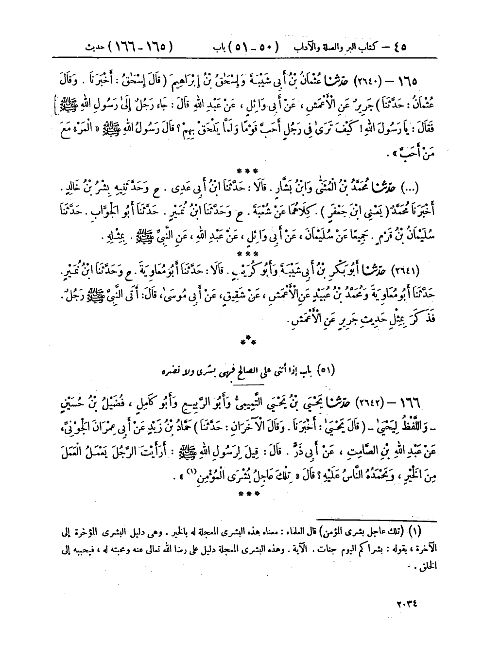 ١٦٥ - (٢٦٤٠) حَدَّثَنَا عُثْمَانُ بْنُ أَبِي شَيْبَةَ، وَإِسْحَاقُ بْنُ إِبْرَاهِيمَ - قَالَ إِسْحَاقُ: أَخْبَرَنَا، وقَالَ عُثْمَانُ: حَدَّثَنَا - جَرِيرٌ، عَنِ الْأَعْمَشِ، عَنْ أَبِي وَائِلٍ، عَنْ عَبْدِ اللهِ، قَالَ: جَاءَ رَجُلٌ إِلَى رَسُولِ اللهِ صَلَّى اللهُ عَلَيْهِ وَسَلَّمَ فَقَالَ: يَا رَسُولَ اللهِ كَيْفَ تَرَى فِي رَجُلٍ أَحَبَّ قَوْمًا وَلَمَّا يَلْحَقْ بِهِمْ؟ قَالَ رَسُولُ اللهِ صَلَّى اللهُ عَلَيْهِ وَسَلَّمَ: «الْمَرْءُ مَعَ مَنْ أَحَبَّ»
