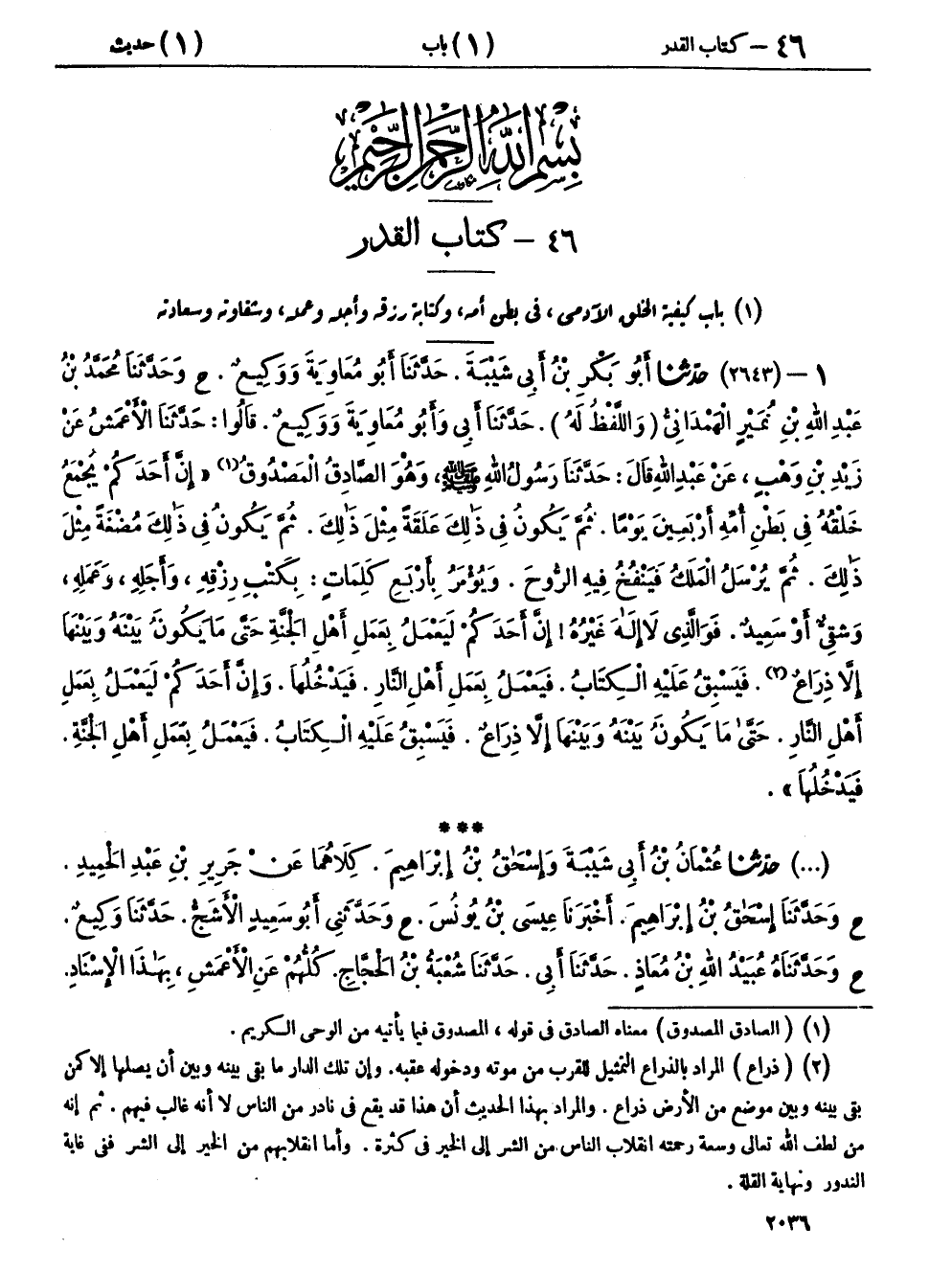١ - (٢٦٤٣) حَدَّثَنَا أَبُو بَكْرِ بْنُ أَبِي شَيْبَةَ، حَدَّثَنَا أَبُو مُعَاوِيَةَ، وَوَكِيعٌ، ح وَحَدَّثَنَا مُحَمَّدُ بْنُ عَبْدِ اللهِ بْنِ نُمَيْرٍ الْهَمْدَانِيُّ - وَاللَّفْظُ لَهُ - حَدَّثَنَا أَبِي، وَأَبُو مُعَاوِيَةَ، وَوَكِيعٌ، قَالُوا: حَدَّثَنَا الْأَعْمَشُ، عَنْ زَيْدِ بْنِ وَهْبٍ، عَنْ عَبْدِ اللهِ، قَالَ: حَدَّثَنَا رَسُولُ اللهِ صَلَّى اللهُ عَلَيْهِ وَسَلَّمَ وَهُوَ الصَّادِقُ الْمَصْدُوقُ " إِنَّ أَحَدَكُمْ يُجْمَعُ خَلْقُهُ فِي بَطْنِ أُمِّهِ أَرْبَعِينَ يَوْمًا، ثُمَّ يَكُونُ فِي ذَلِكَ عَلَقَةً مِثْلَ ذَلِكَ، ثُمَّ يَكُونُ فِي ذَلِكَ مُضْغَةً مِثْلَ ذَلِكَ، ثُمَّ يُرْسَلُ الْمَلَكُ فَيَنْفُخُ فِيهِ الرُّوحَ، وَيُؤْمَرُ بِأَرْبَعِ كَلِمَاتٍ: بِكَتْبِ رِزْقِهِ، وَأَجَلِهِ، وَعَمَلِهِ، وَشَقِيٌّ أَوْ سَعِيدٌ، فَوَالَّذِي لَا إِلَهَ غَيْرُهُ إِنَّ أَحَدَكُمْ لَيَعْمَلُ بِعَمَلِ أَهْلِ الْجَنَّةِ حَتَّى مَا يَكُونُ بَيْنَهُ وَبَيْنَهَا إِلَّا ذِرَاعٌ، فَيَسْبِقُ عَلَيْهِ الْكِتَابُ، فَيَعْمَلُ بِعَمَلِ أَهْلِ النَّارِ، فَيَدْخُلُهَا، وَإِنَّ أَحَدَكُمْ لَيَعْمَلُ بِعَمَلِ أَهْلِ النَّارِ، حَتَّى مَا يَكُونُ بَيْنَهُ وَبَيْنَهَا إِلَّا ذِرَاعٌ، فَيَسْبِقُ عَلَيْهِ الْكِتَابُ، فَيَعْمَلُ بِعَمَلِ أَهْلِ الْجَنَّةِ، فَيَدْخُلُهَا "