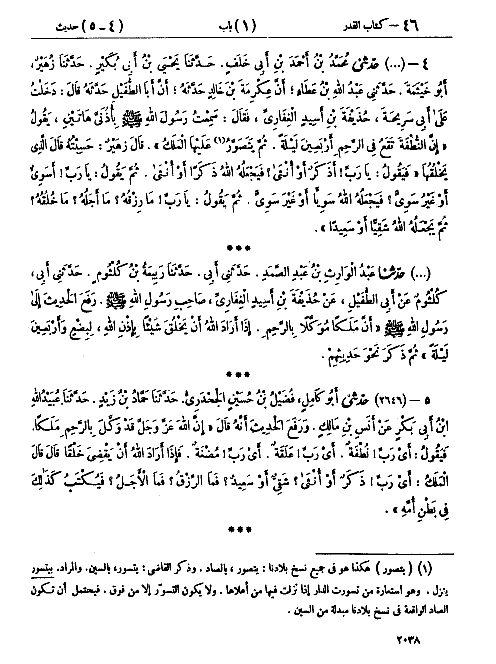 ٥ - (٢٦٤٦) حَدَّثَنِي أَبُو كَامِلٍ فُضَيْلُ بْنُ حُسَيْنٍ الْجَحْدَرِيُّ، حَدَّثَنَا حَمَّادُ بْنُ زَيْدٍ، حَدَّثَنَا عُبَيْدُ اللهِ بْنُ أَبِي بَكْرٍ، عَنْ أَنَسِ بْنِ مَالِكٍ، وَرَفَعَ الْحَدِيثَ، أَنَّهُ قَالَ: " إِنَّ اللهَ عَزَّ وَجَلَّ قَدْ وَكَّلَ بِالرَّحِمِ مَلَكًا، فَيَقُولُ: أَيْ رَبِّ نُطْفَةٌ، أَيْ رَبِّ عَلَقَةٌ، أَيْ رَبِّ مُضْغَةٌ، فَإِذَا أَرَادَ اللهُ أَنْ يَقْضِيَ خَلْقًا قَالَ: قَالَ الْمَلَكُ: أَيْ رَبِّ ذَكَرٌ أَوْ أُنْثَى؟ شَقِيٌّ أَوْ سَعِيدٌ؟ فَمَا الرِّزْقُ؟ فَمَا الْأَجَلُ؟ فَيُكْتَبُ كَذَلِكَ فِي بَطْنِ أُمِّهِ "