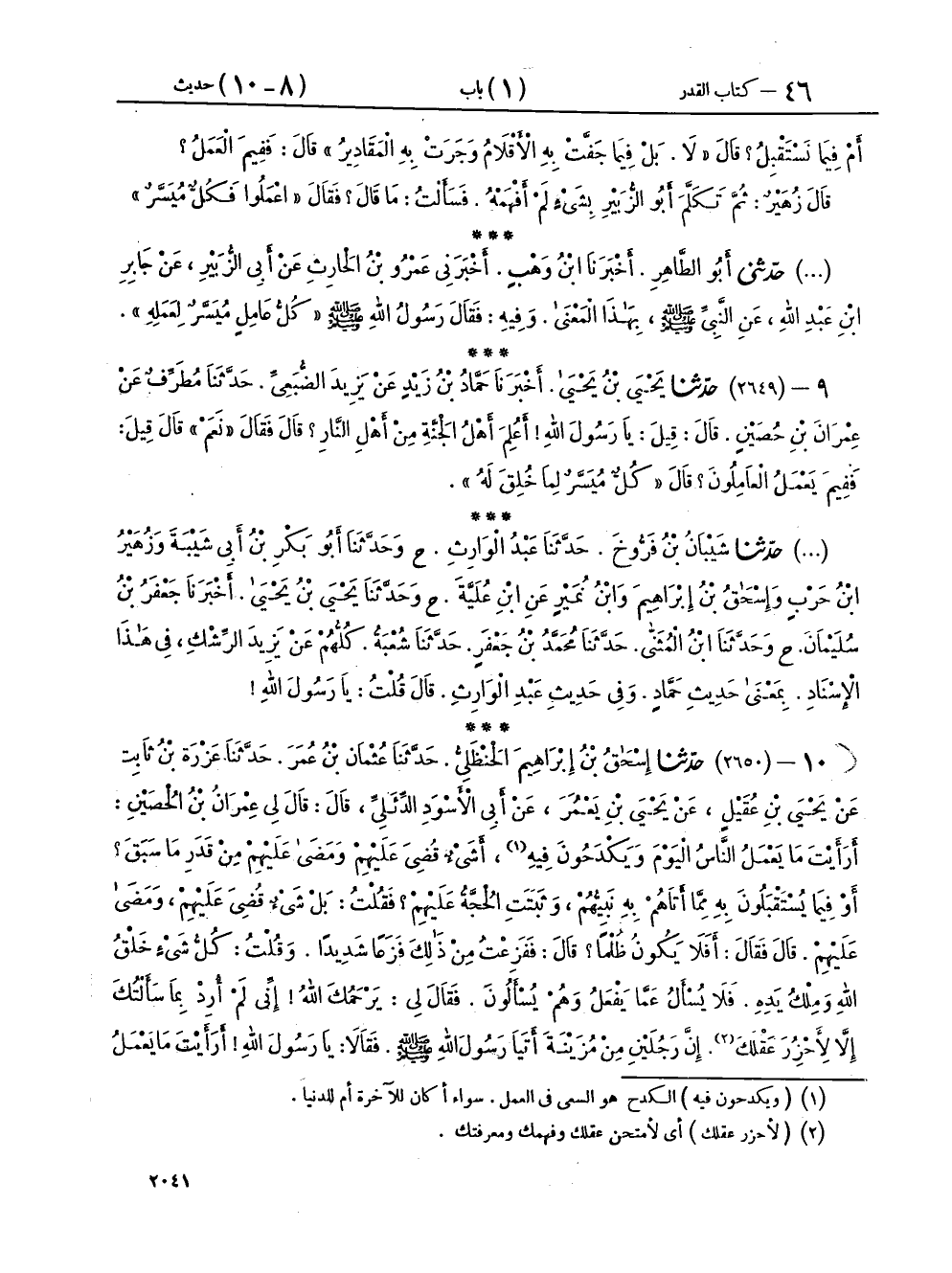 ٩ - (٢٦٤٩) حَدَّثَنَا يَحْيَى بْنُ يَحْيَى، أَخْبَرَنَا حَمَّادُ بْنُ زَيْدٍ، عَنْ يَزِيدَ الضُّبَعِيِّ، حَدَّثَنَا مُطَرِّفٌ، عَنْ عِمْرَانَ بْنِ حُصَيْنٍ، قَالَ: قِيلَ: يَا رَسُولَ اللهِ أَعُلِمَ أَهْلُ الْجَنَّةِ مَنْ أَهْلِ النَّارِ؟ قَالَ: فَقَالَ: نَعَمْ، قَالَ قِيلَ: فَفِيمَ يَعْمَلُ الْعَامِلُونَ؟ قَالَ: «كُلٌّ مُيَسَّرٌ لِمَا خُلِقَ لَهُ»