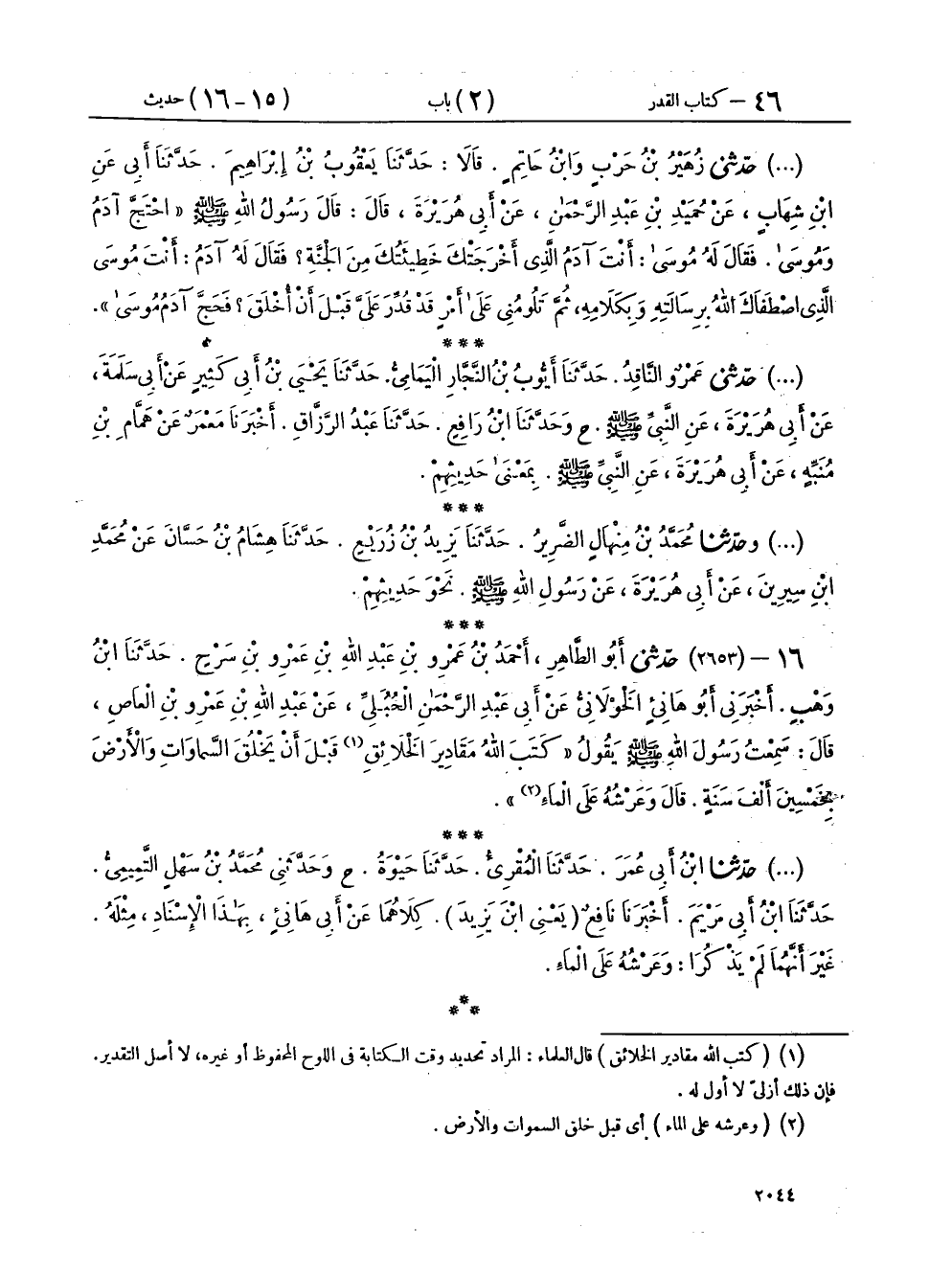 ١٦ - (٢٦٥٣) حَدَّثَنِي أَبُو الطَّاهِرِ أَحْمَدُ بْنُ عَمْرِو بْنِ عَبْدِ اللهِ بْنِ سَرْحٍ، حَدَّثَنَا ابْنُ وَهْبٍ، أَخْبَرَنِي أَبُو هَانِئٍ الْخَوْلَانِيُّ، عَنْ أَبِي عَبْدِ الرَّحْمَنِ الْحُبُلِيِّ، عَنْ عَبْدِ اللهِ بْنِ عَمْرِو بْنِ الْعَاصِ، قَالَ: سَمِعْتُ رَسُولَ اللهِ صَلَّى اللهُ عَلَيْهِ وَسَلَّمَ، يَقُولُ: " كَتَبَ اللهُ مَقَادِيرَ الْخَلَائِقِ قَبْلَ أَنْ يَخْلُقَ السَّمَاوَاتِ وَالْأَرْضَ بِخَمْسِينَ أَلْفَ سَنَةٍ، قَالَ: وَعَرْشُهُ عَلَى الْمَاءِ "،