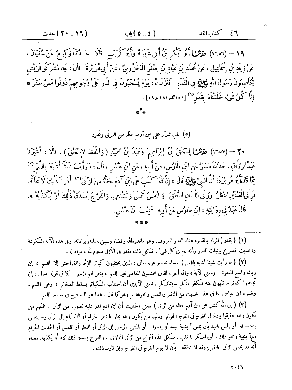 ٢٠ - (٢٦٥٧) حَدَّثَنَا إِسْحَاقُ بْنُ إِبْرَاهِيمَ، وَعَبْدُ بْنُ حُمَيْدٍ - وَاللَّفْظُ لِإِسْحَاقَ - قَالَا: أَخْبَرَنَا عَبْدُ الرَّزَّاقِ، حَدَّثَنَا مَعْمَرٌ، عَنِ ابْنِ طَاوُسٍ، عَنْ أَبِيهِ، عَنِ ابْنِ عَبَّاسٍ، قَالَ: مَا رَأَيْتُ شَيْئًا أَشْبَهَ بِاللَّمَمِ مِمَّا قَالَ أَبُو هُرَيْرَةَ: أَنَّ النَّبِيَّ صَلَّى اللهُ عَلَيْهِ وَسَلَّمَ قَالَ: «إِنَّ اللهَ كَتَبَ عَلَى ابْنِ آدَمَ حَظَّهُ مِنَ الزِّنَا، أَدْرَكَ ذَلِكَ لَا مَحَالَةَ، فَزِنَا الْعَيْنَيْنِ النَّظَرُ، وَزِنَا اللِّسَانِ النُّطْقُ، وَالنَّفْسُ تَمَنَّى وَتَشْتَهِي، وَالْفَرْجُ يُصَدِّقُ ذَلِكَ أَوْ يُكَذِّبُهُ»، قَالَ عَبْدٌ فِي رِوَايَتِهِ: ابْنِ طَاوُسٍ، عَنْ أَبِيهِ، سَمِعْتُ ابْنَ عَبَّاسٍ