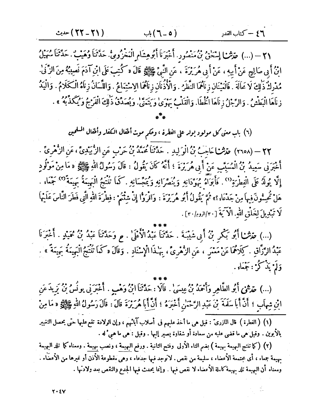 ٢٢ - (٢٦٥٨) حَدَّثَنَا حَاجِبُ بْنُ الْوَلِيدِ، حَدَّثَنَا مُحَمَّدُ بْنُ حَرْبٍ، عَنِ الزُّبَيْدِيِّ، عَنِ الزُّهْرِيِّ، أَخْبَرَنِي سَعِيدُ بْنُ الْمُسَيِّبِ، عَنْ أَبِي هُرَيْرَةَ، أَنَّهُ كَانَ يَقُولُ: قَالَ رَسُولُ اللهِ صَلَّى اللهُ عَلَيْهِ وَسَلَّمَ: «مَا مِنْ مَوْلُودٍ إِلَّا يُولَدُ عَلَى الْفِطْرَةِ، فَأَبَوَاهُ يُهَوِّدَانِهِ وَيُنَصِّرَانِهِ وَيُمَجِّسَانِهِ، كَمَا تُنْتَجُ الْبَهِيمَةُ بَهِيمَةً جَمْعَاءَ، هَلْ تُحِسُّونَ فِيهَا مِنْ جَدْعَاءَ؟» ثُمَّ يَقُولُ: أَبُو هُرَيْرَةَ وَاقْرَءُوا إِنْ شِئْتُمْ: {فِطْرَةَ اللهِ الَّتِي فَطَرَ النَّاسَ عَلَيْهَا لَا تَبْدِيلَ لِخَلْقِ اللهِ} [الروم: ٣٠] الْآيَةَ