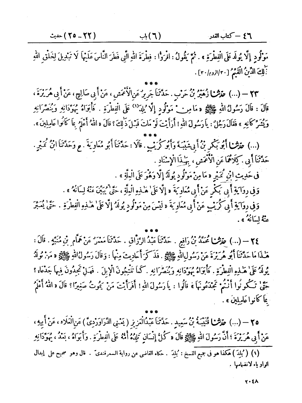 ٢٣ - حَدَّثَنَا أَبُو بَكْرِ بْنُ أَبِي شَيْبَةَ وَأَبُو كُرَيْبٍ، قَالَا: حَدَّثَنَا أَبُو مُعَاوِيَةَ، ح وَحَدَّثَنَا ابْنُ نُمَيْرٍ، حَدَّثَنَا أَبِي، كِلَاهُمَا عَنِ الْأَعْمَشِ، بِهَذَا الْإِسْنَادِ، فِي حَدِيثِ ابْنِ نُمَيْرٍ: «مَا مِنْ مَوْلُودٍ يُولَدُ إِلَّا وَهُوَ عَلَى الْمِلَّةِ» وَفِي رِوَايَةِ أَبِي بَكْرٍ، عَنْ أَبِي مُعَاوِيَةَ: «إِلَّا عَلَى هَذِهِ الْمِلَّةِ، حَتَّى يُبَيِّنَ عَنْهُ لِسَانُهُ» وَفِي رِوَايَةِ أَبِي كُرَيْبٍ، عَنْ أَبِي مُعَاوِيَةَ: «لَيْسَ مِنْ مَوْلُودٍ يُولَدُ إِلَّا عَلَى هَذِهِ الْفِطْرَةِ، حَتَّى يُعَبِّرَ عَنْهُ لِسَانُهُ»